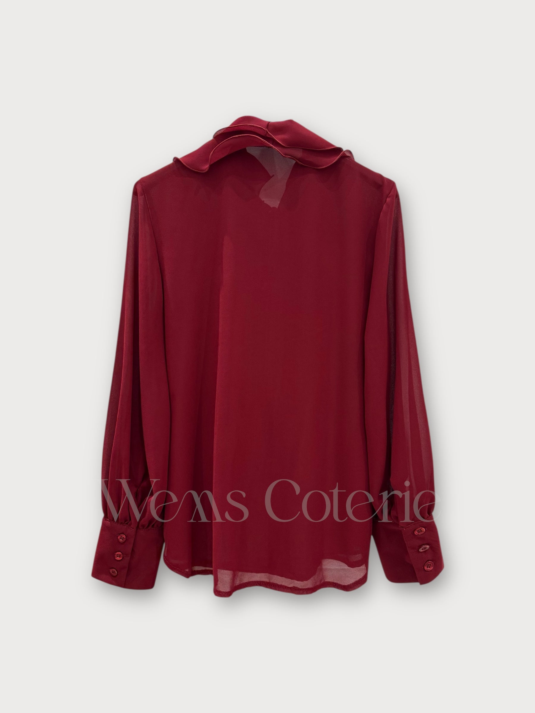 Chiffon blouse defined by a cascading ruffle detail along the front and sleeves finished with tailored, buttoned cuffs.