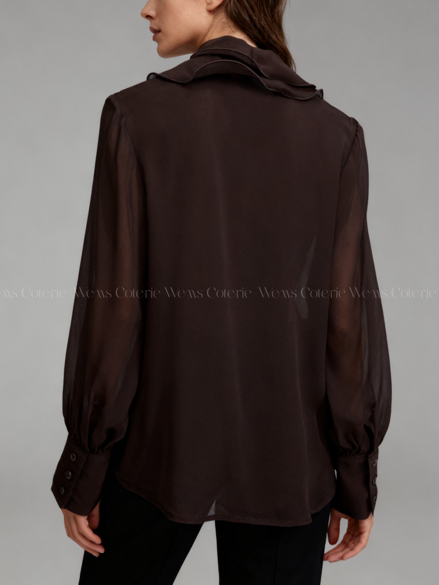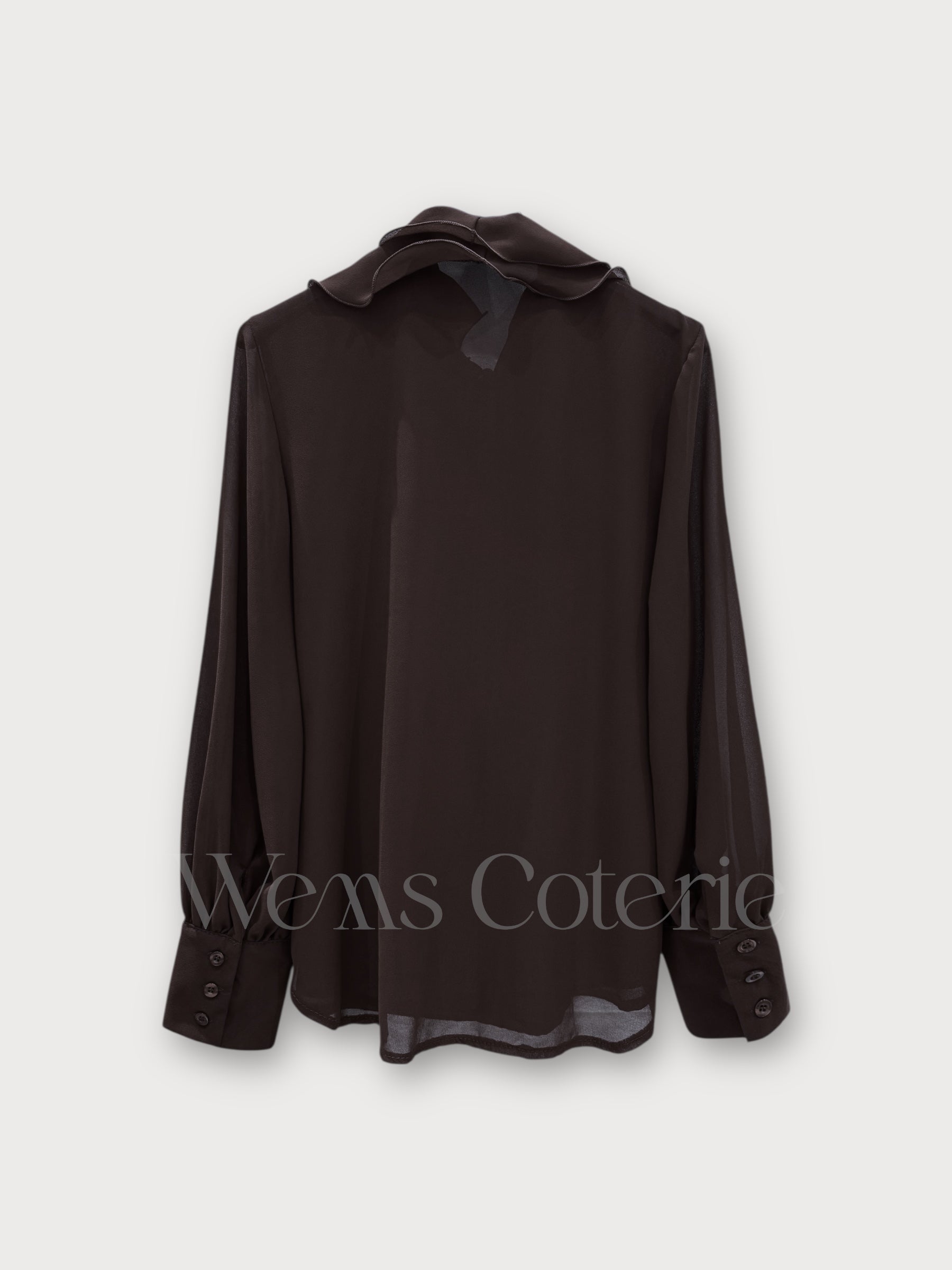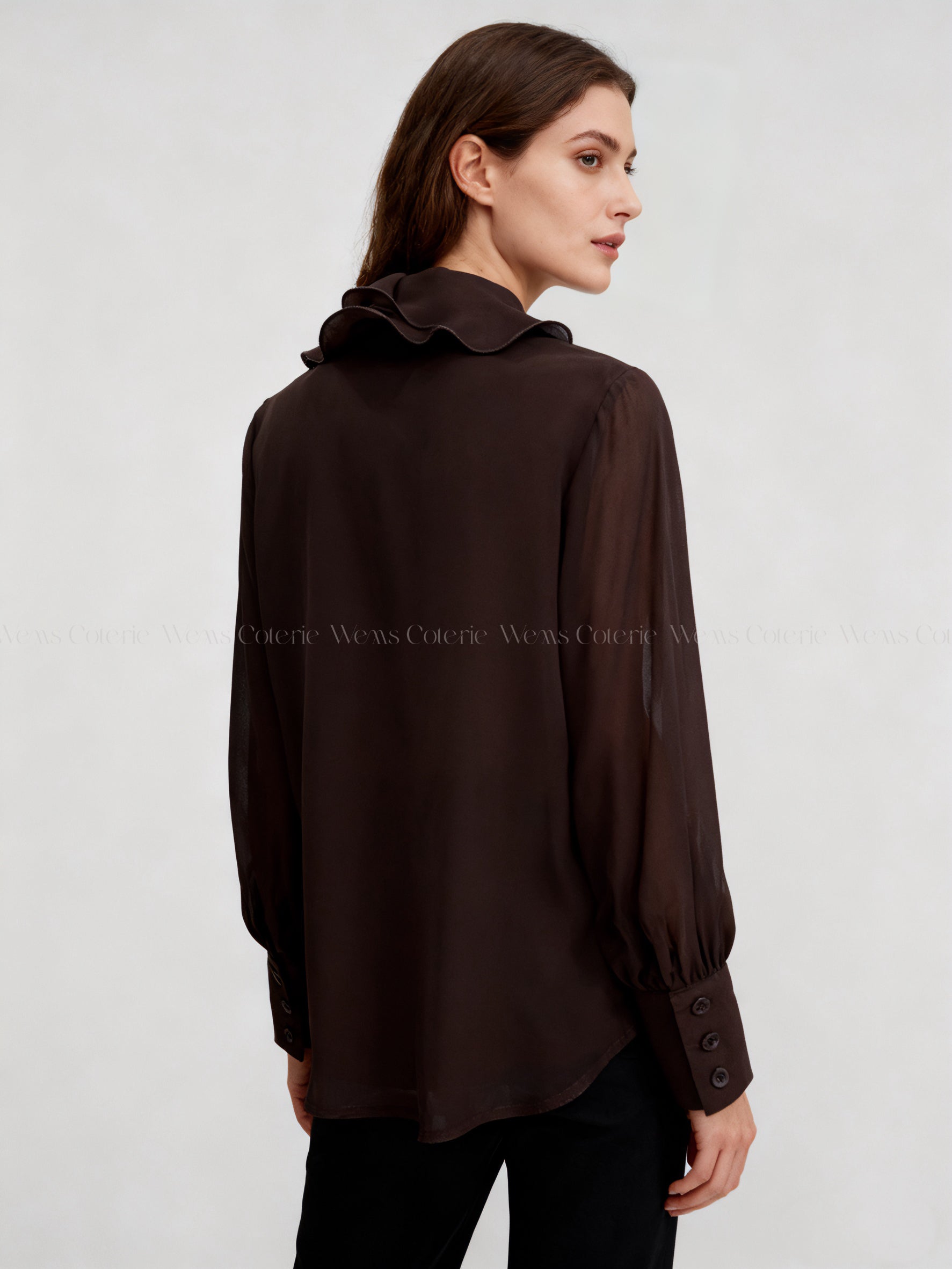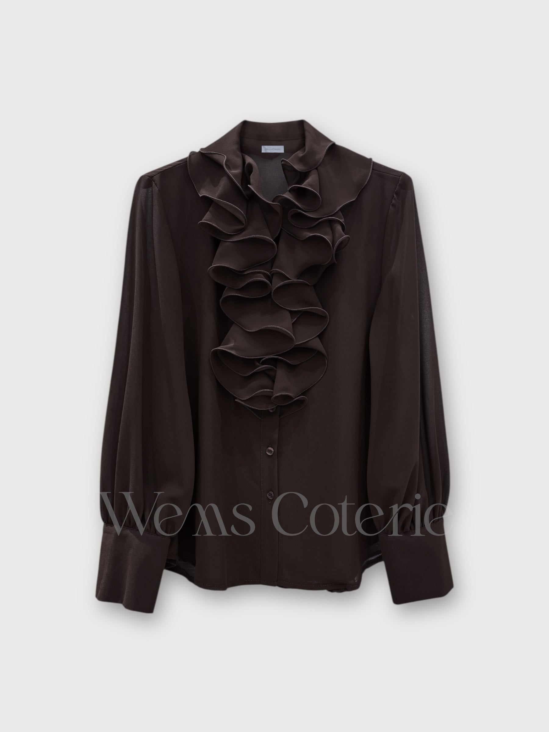 Chiffon blouse defined by a cascading ruffle detail along the front and sleeves finished with tailored, buttoned cuffs.