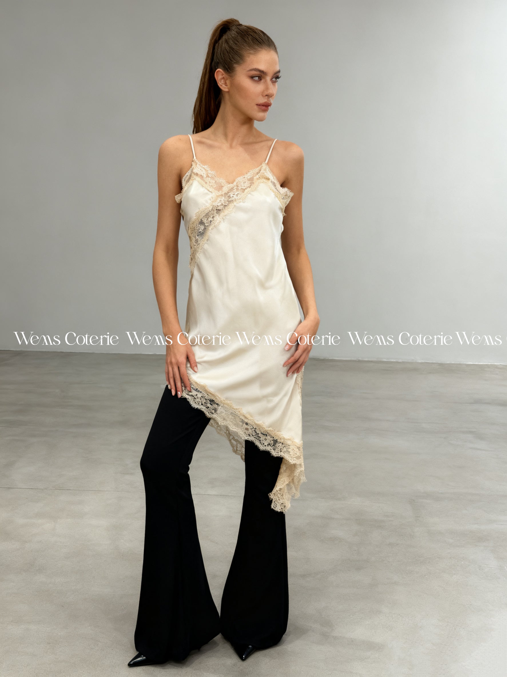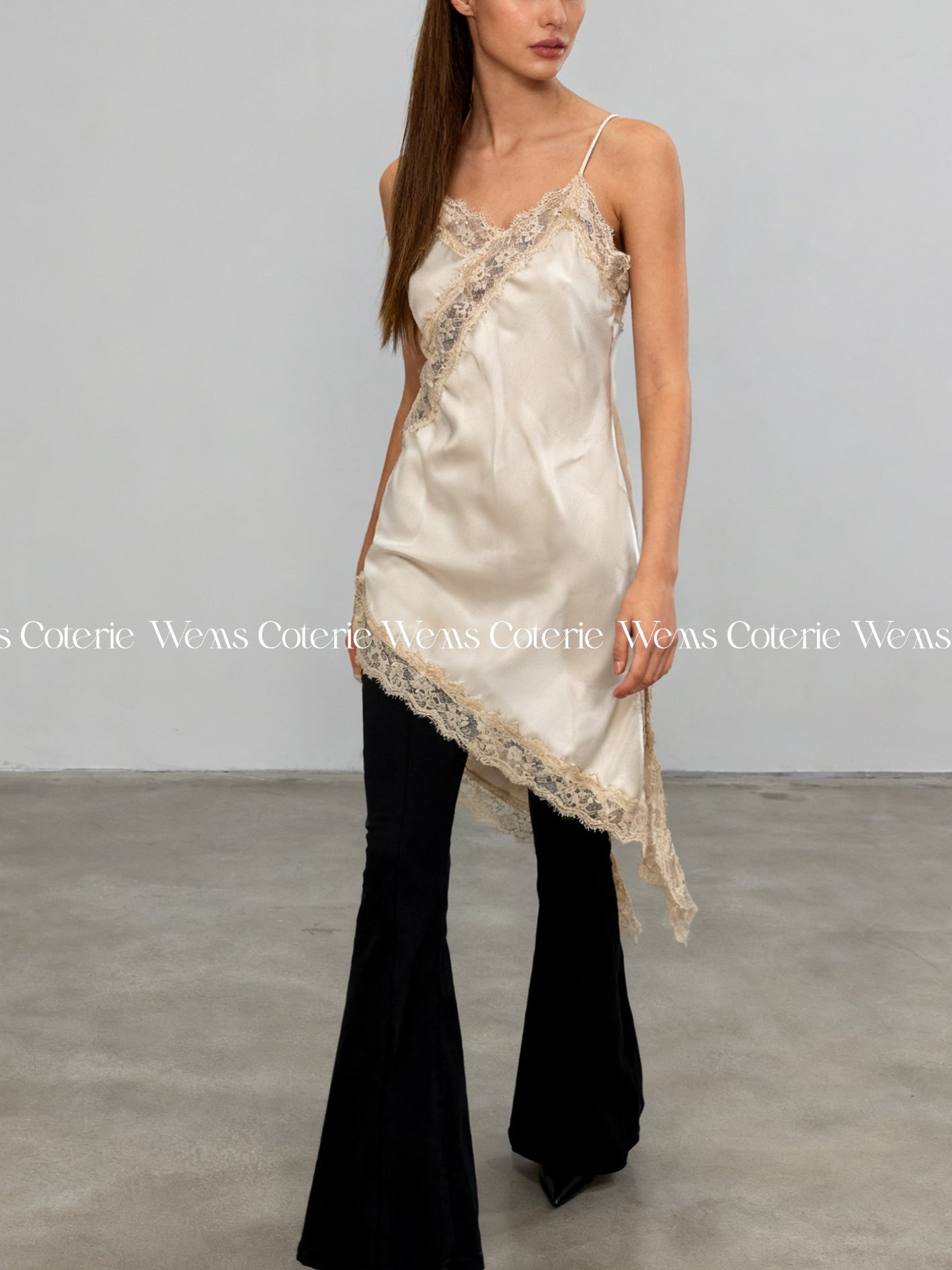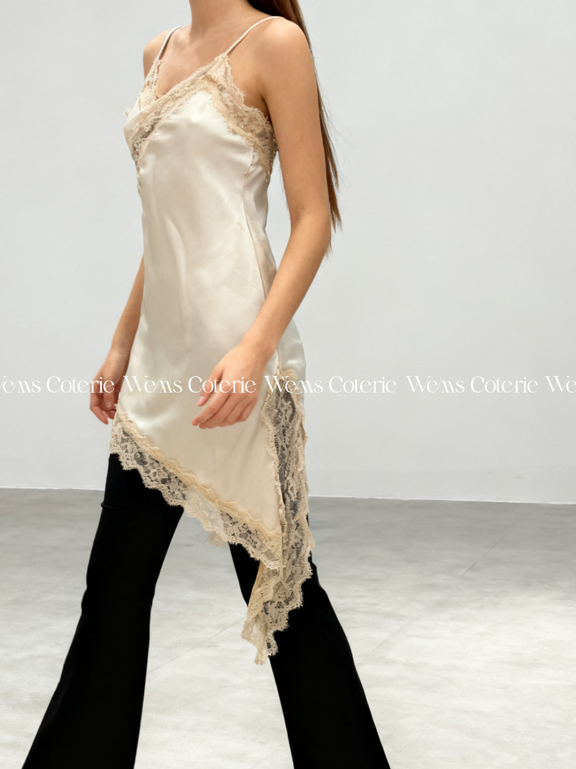 Slip top in satin effect fabric with asymmetrical hemline. The garment is trimmed with lace along the neckline, armholes, and the asymmetrical hem.