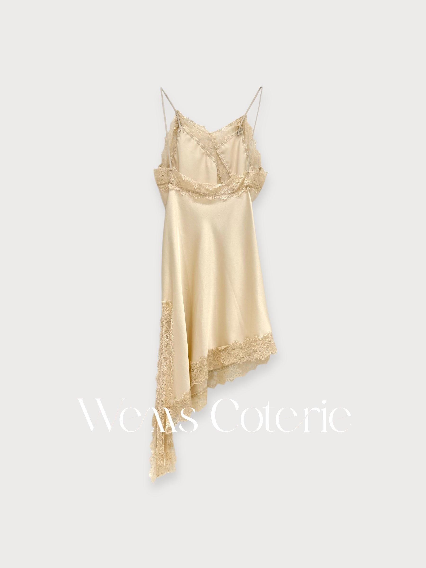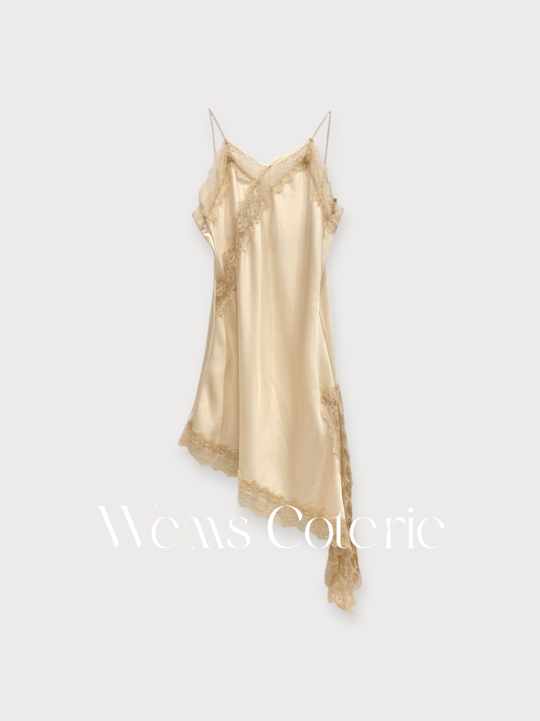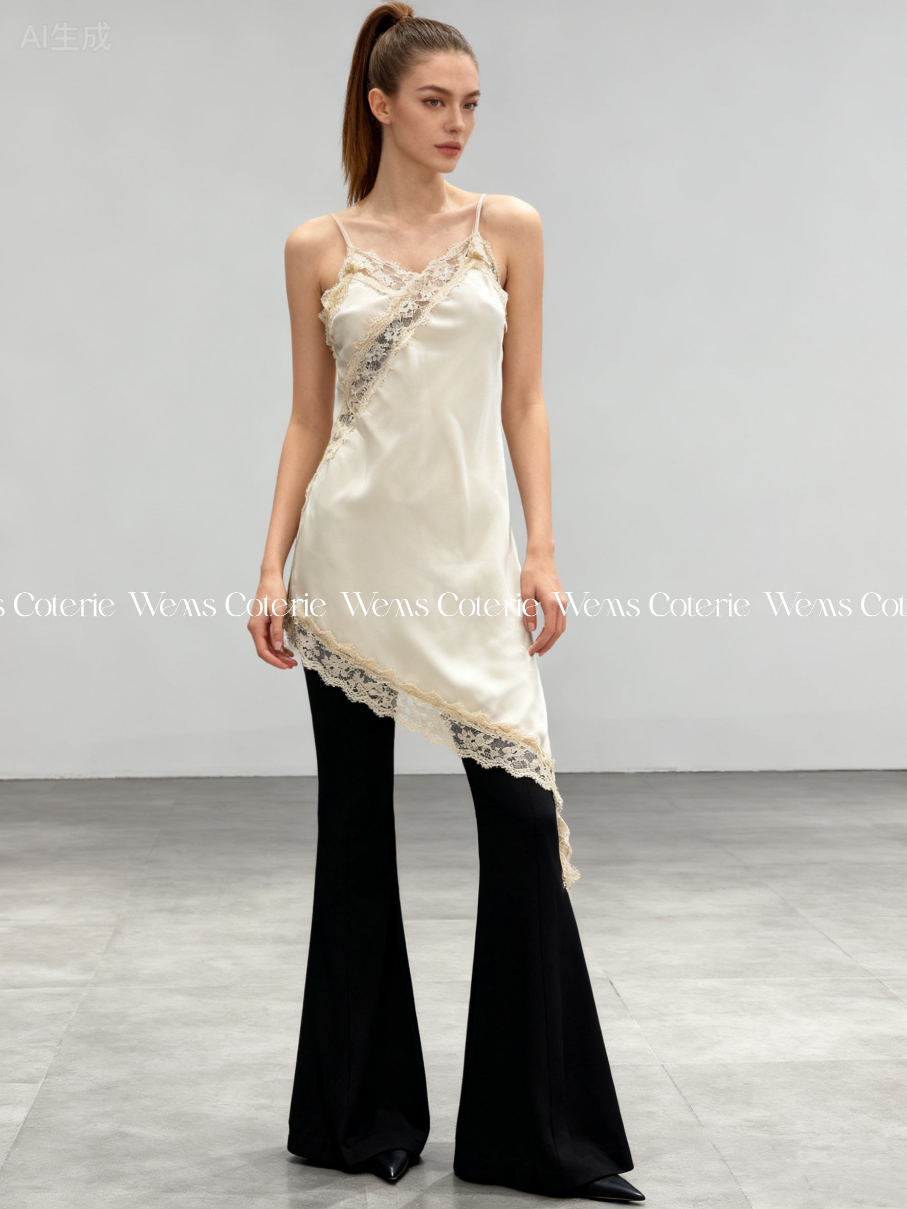 Slip top in satin effect fabric with asymmetrical hemline. The garment is trimmed with lace along the neckline, armholes, and the asymmetrical hem.