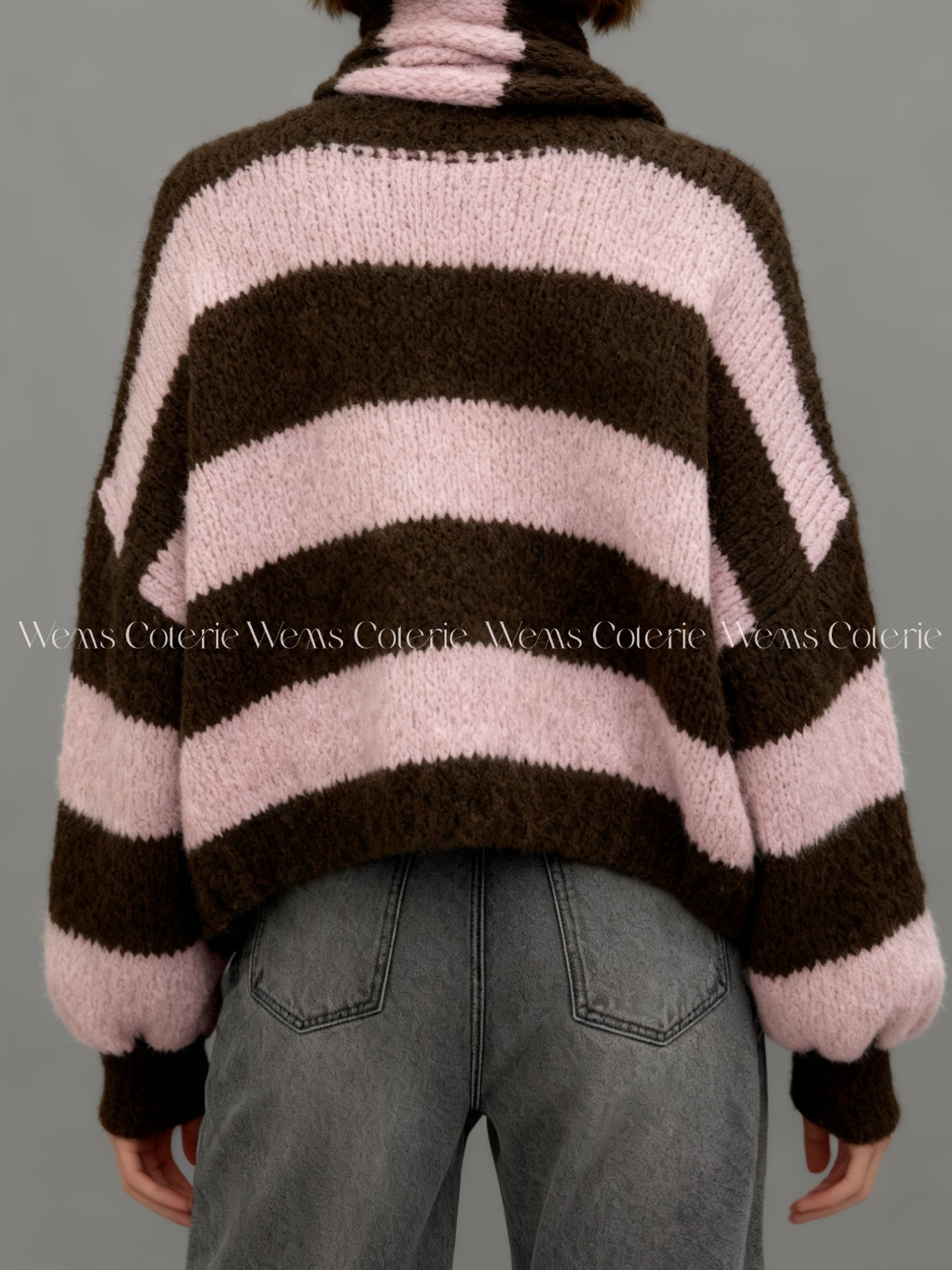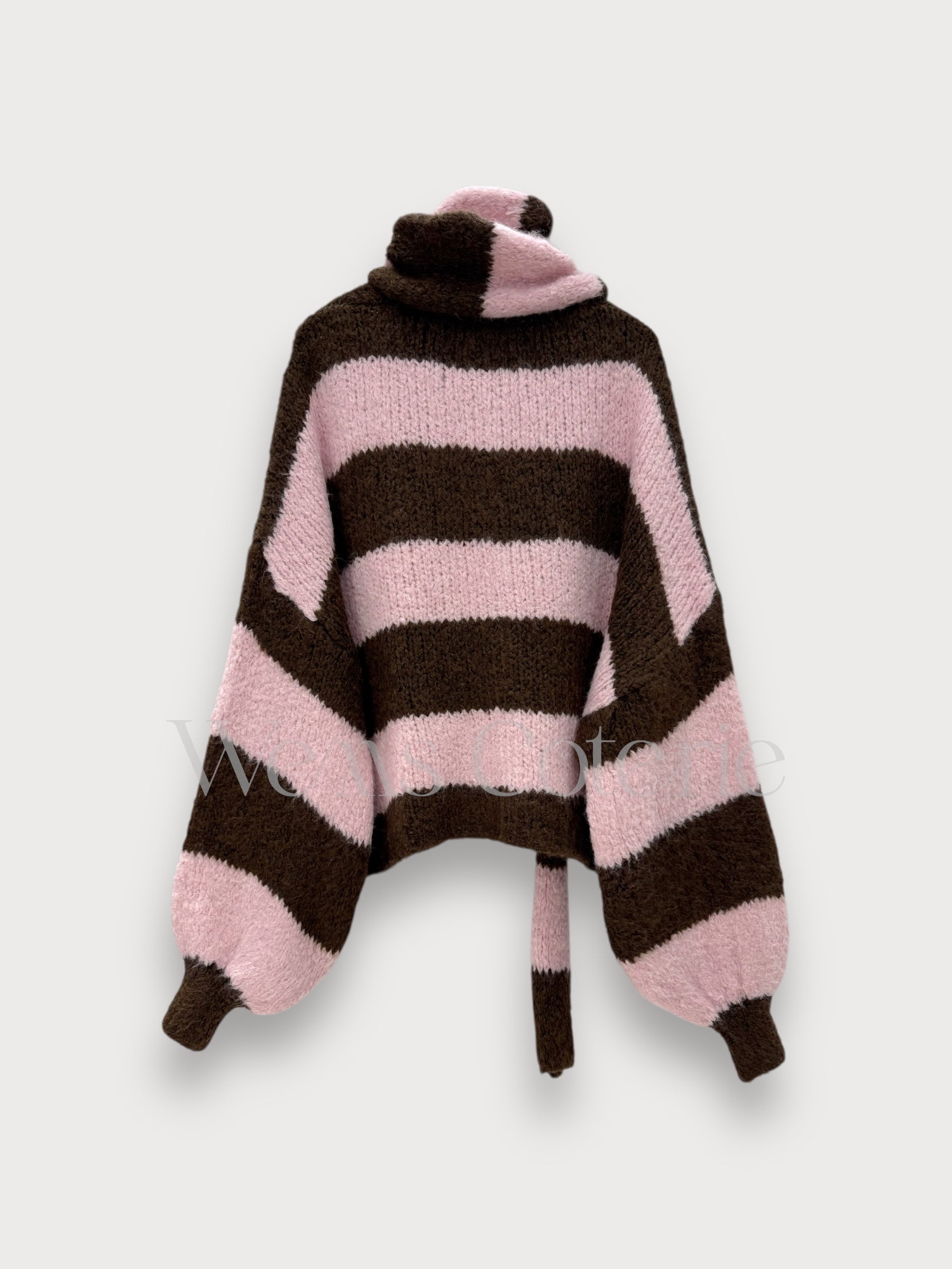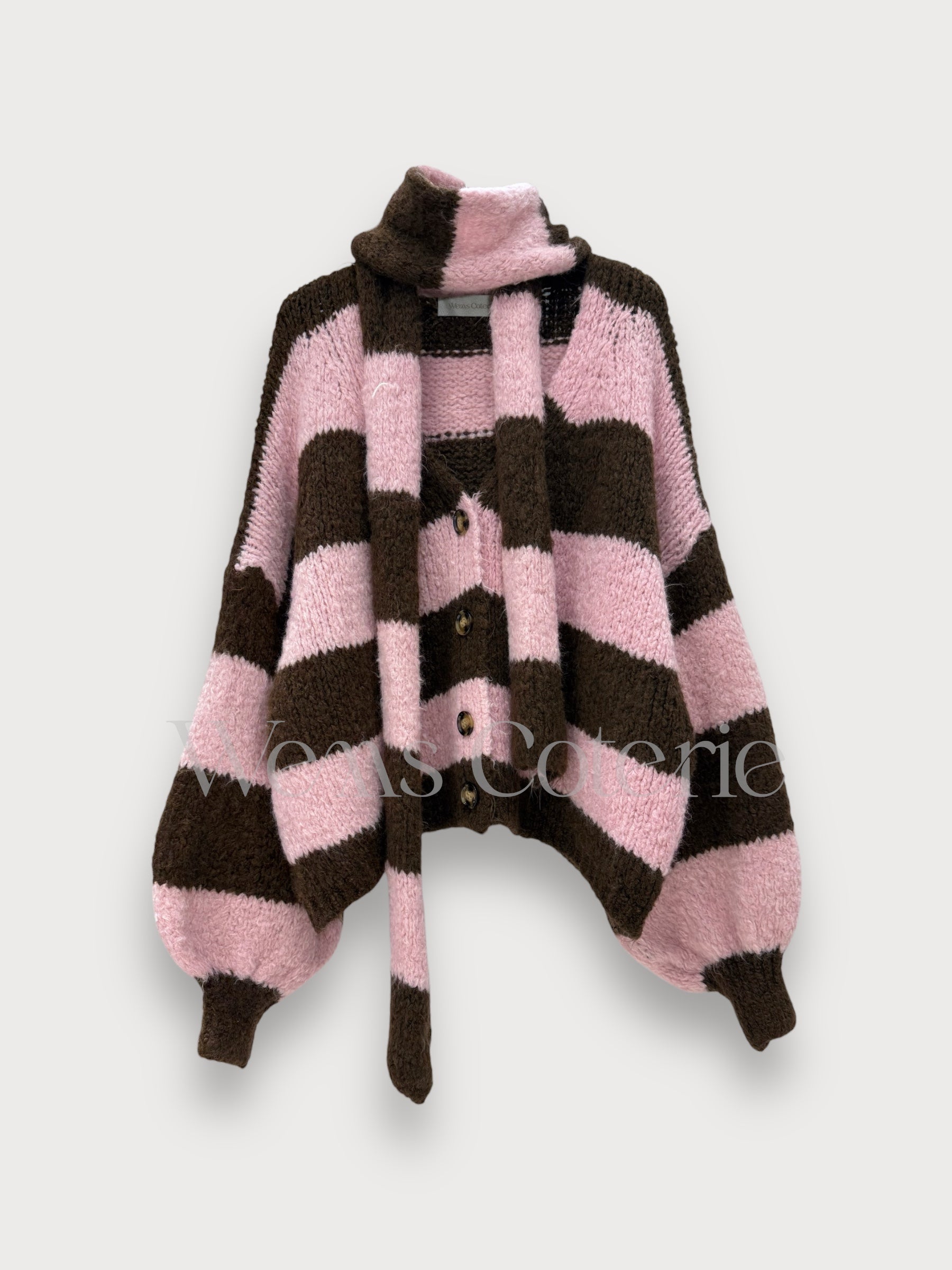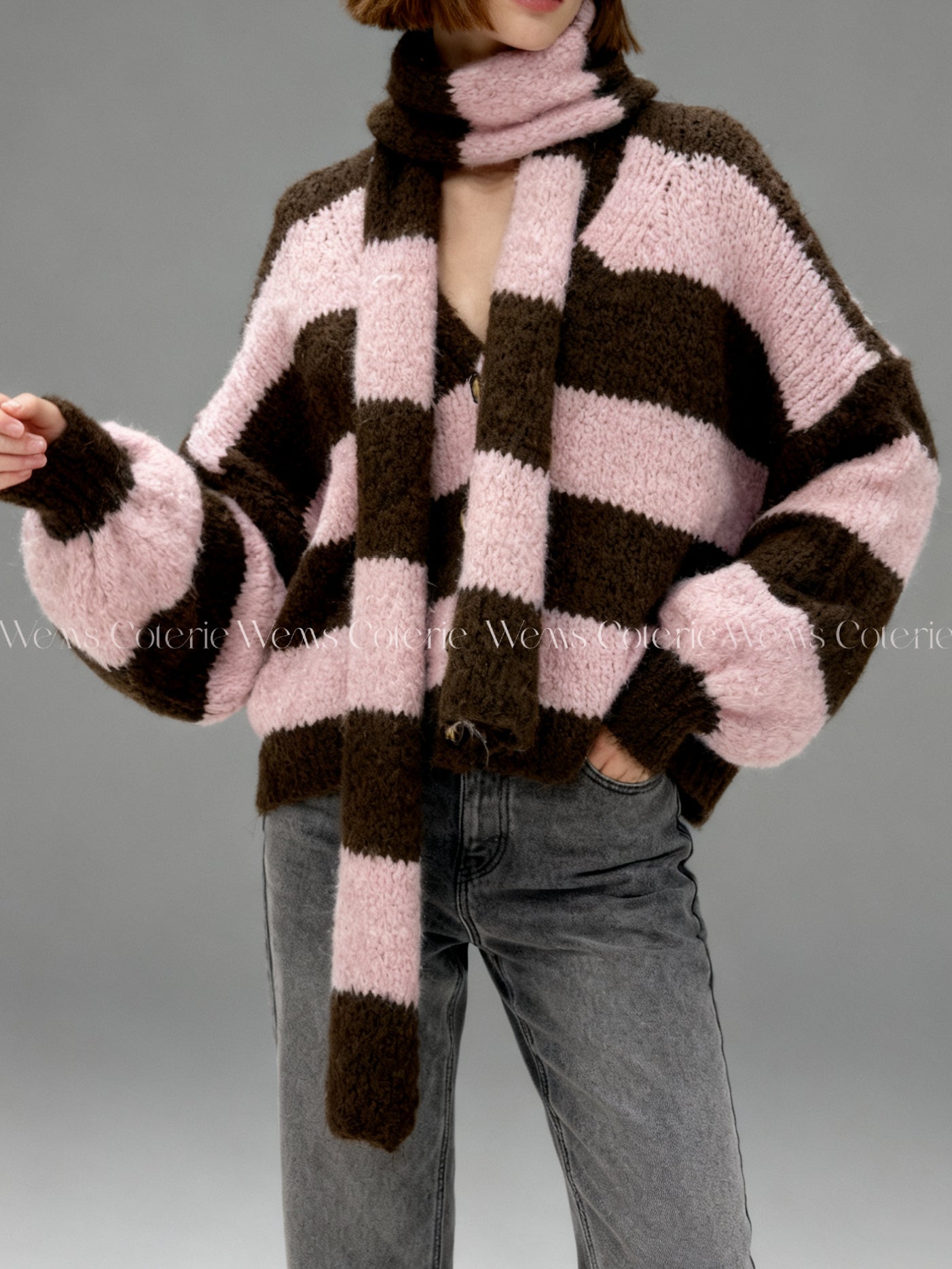 Coordinated two-piece knit set with an oversized, striped cardigan and a matching knit scarf.
