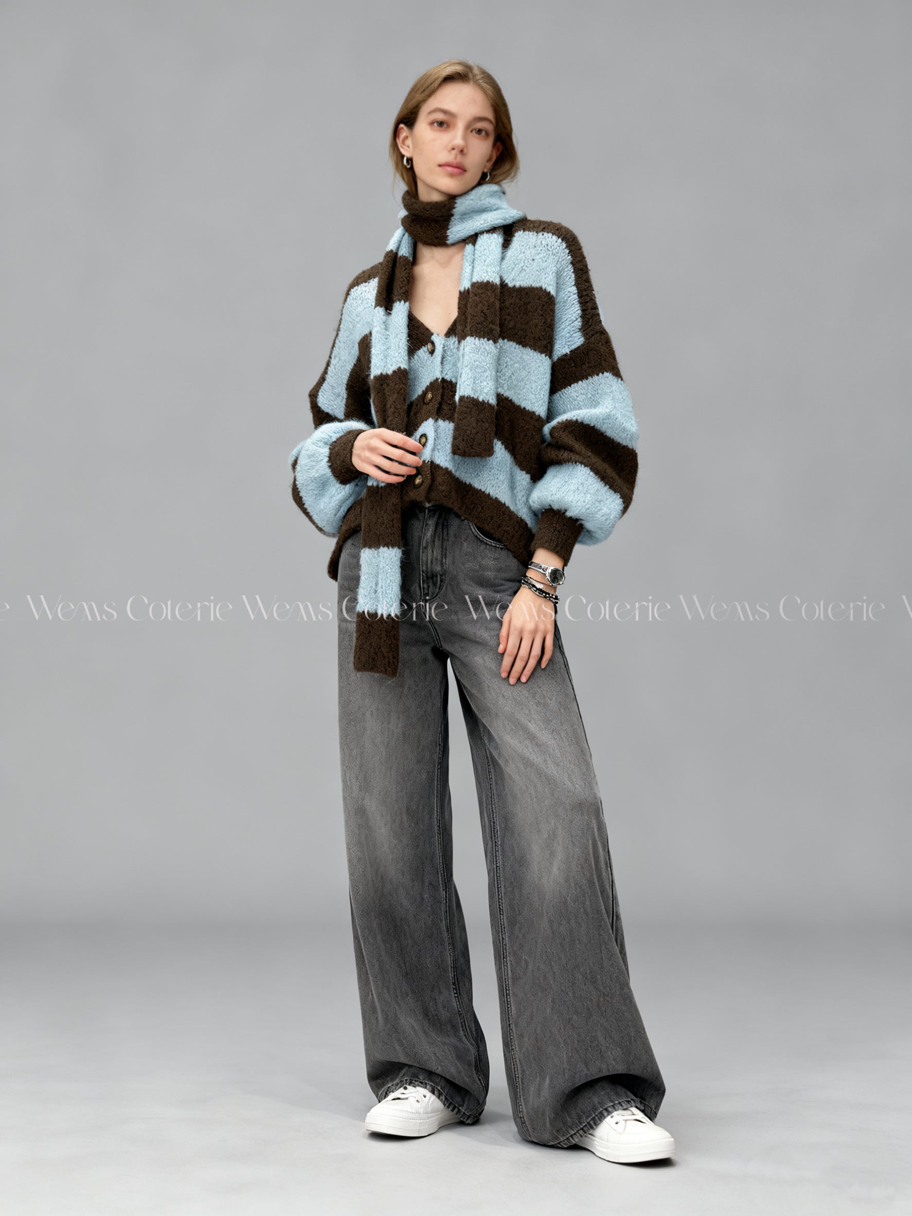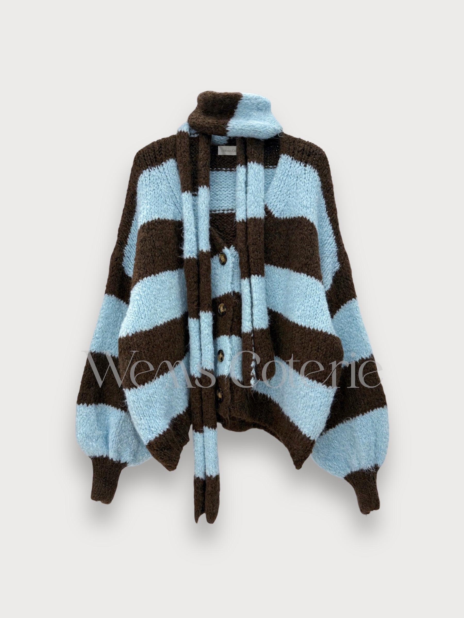 Coordinated two-piece knit set with an oversized, striped cardigan and a matching knit scarf.