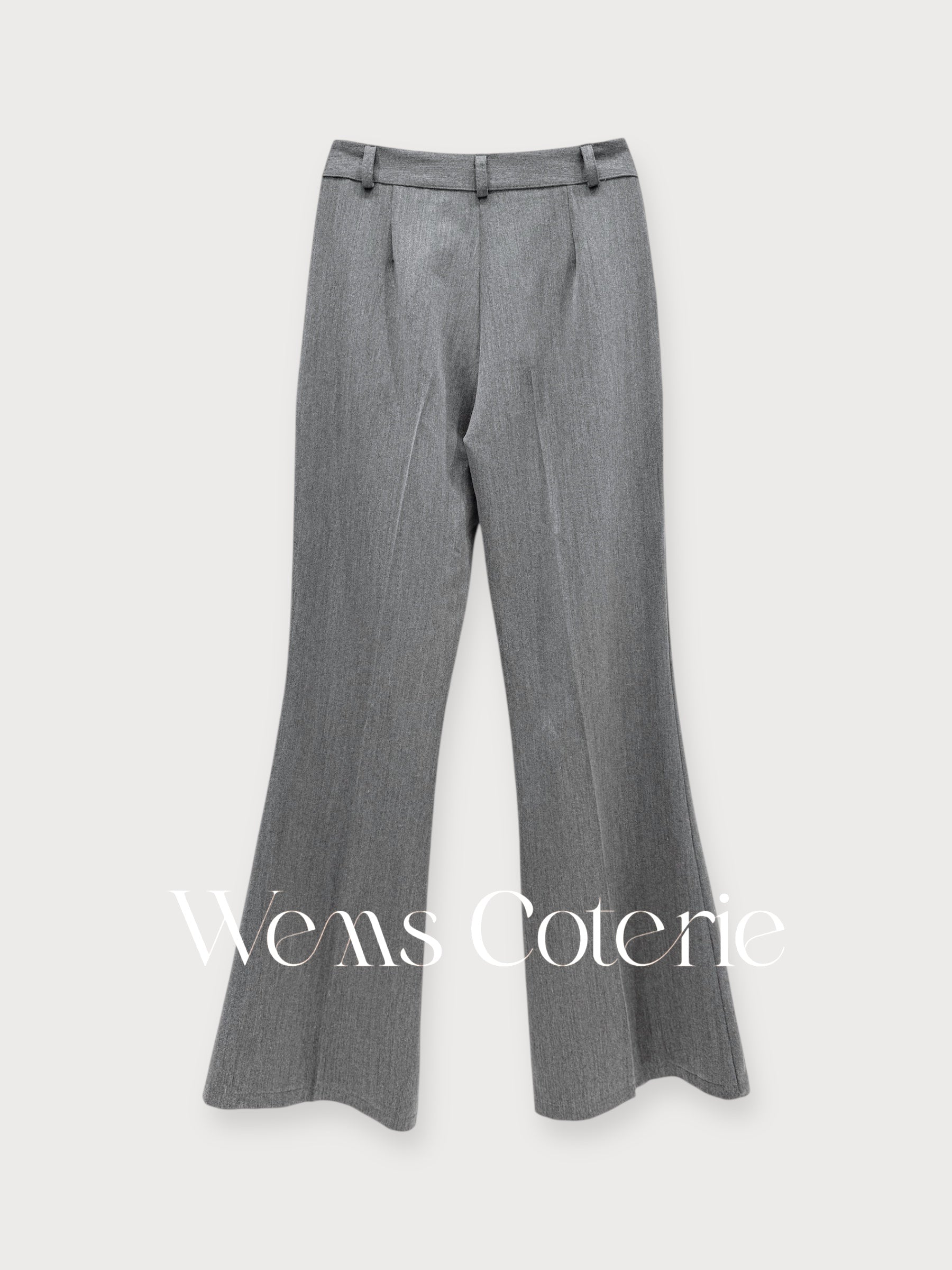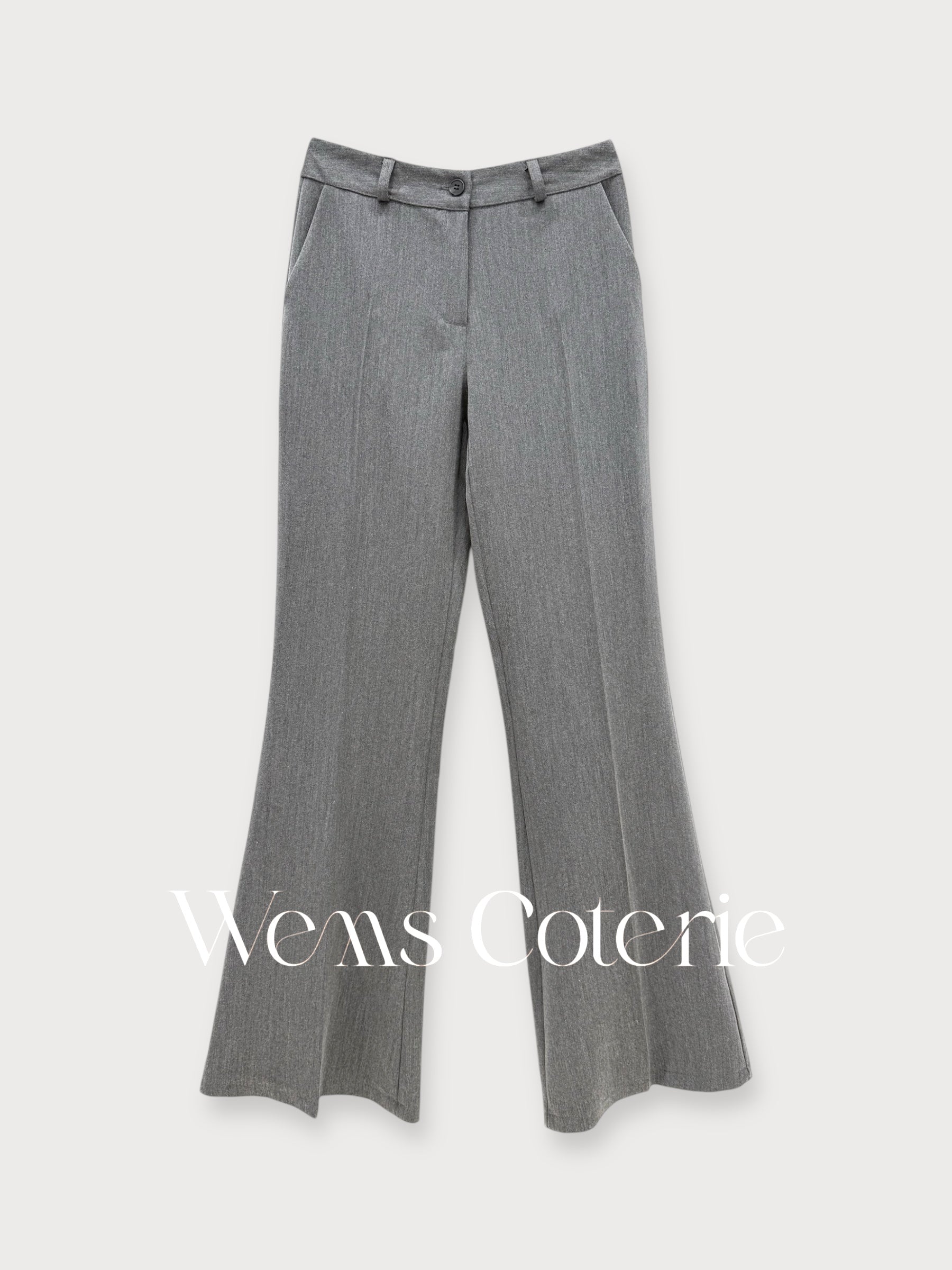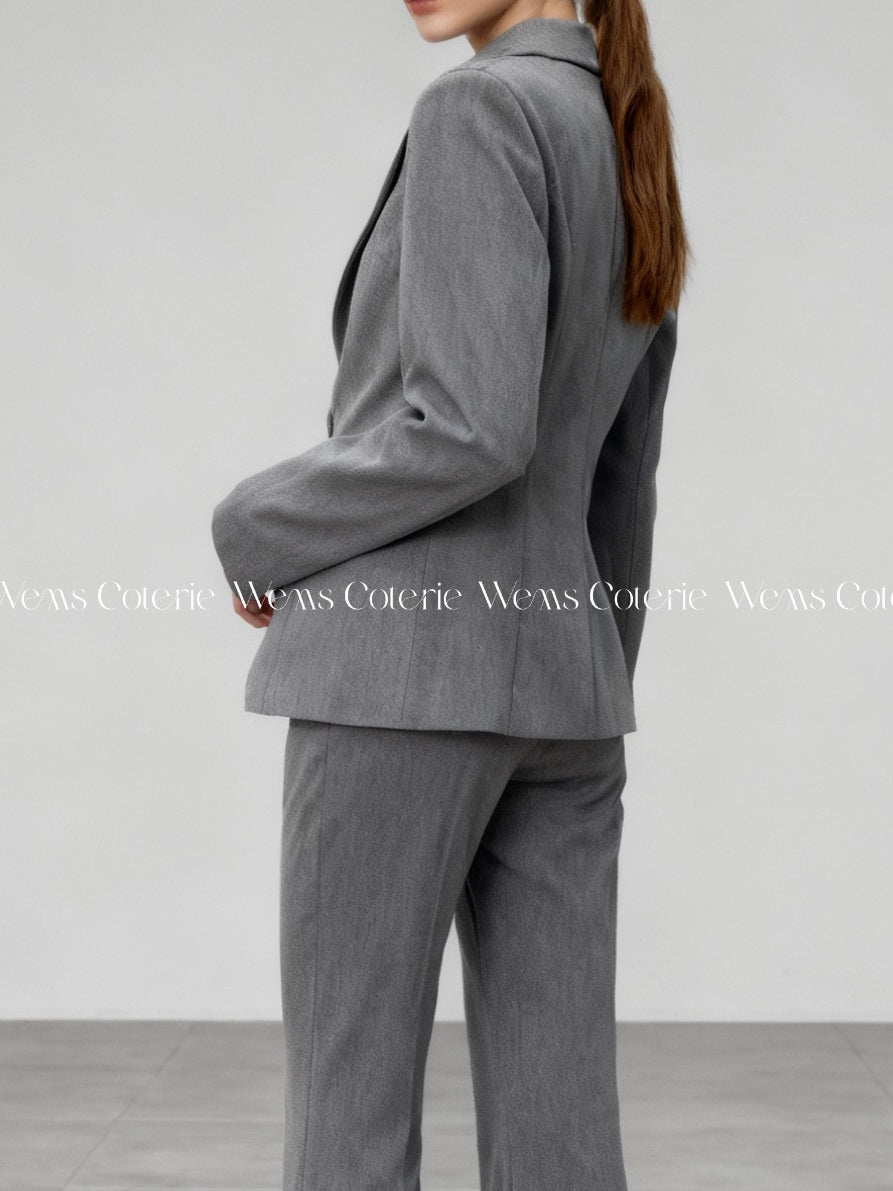 Slim-fit, single-breasted blazer with notched lapels and matching high-waisted trousers that have a subtle flared hem.