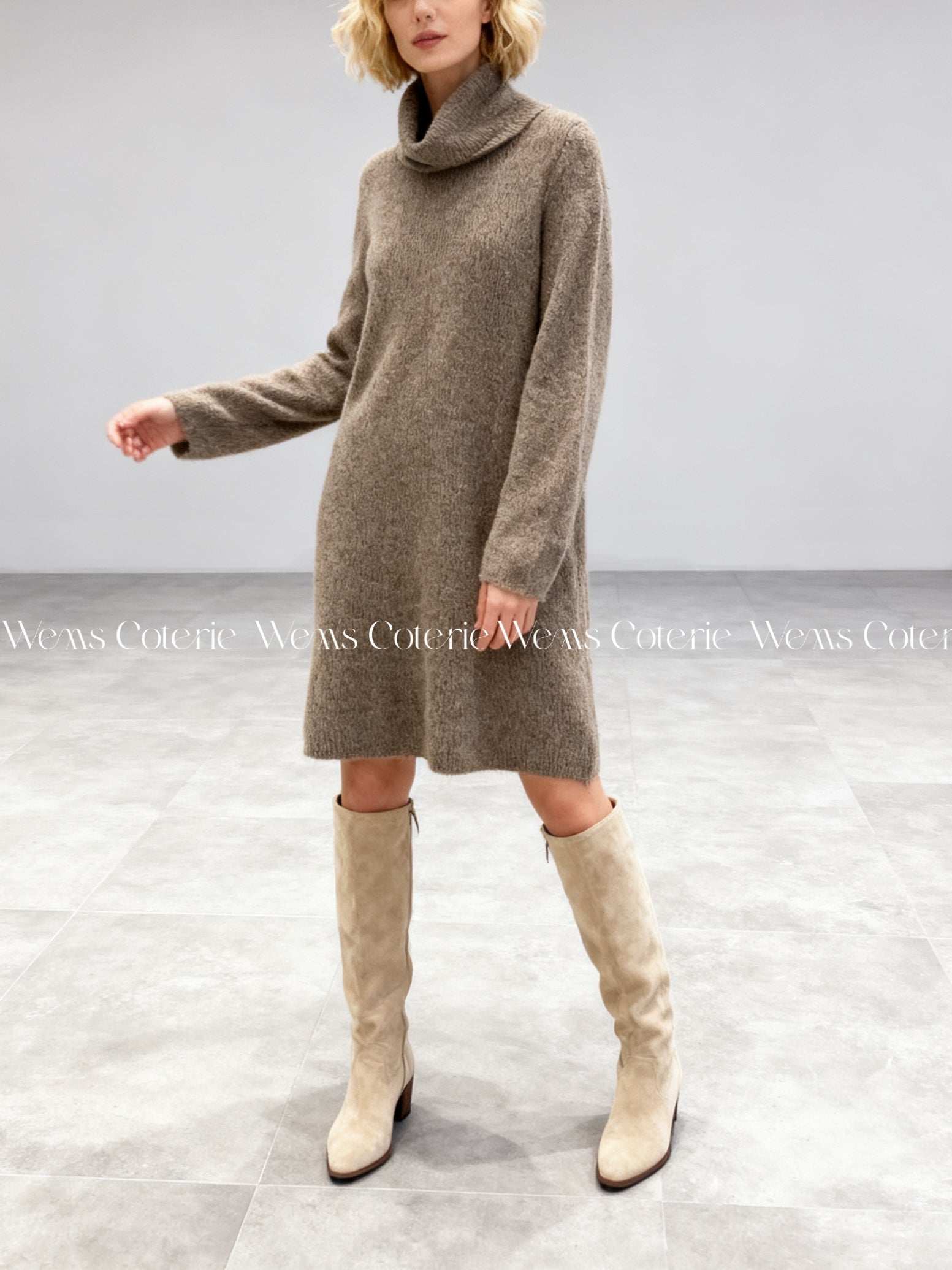 Long-sleeve mini dress with a large, oversized roll-neck and a straight, comfortable fit through the body.