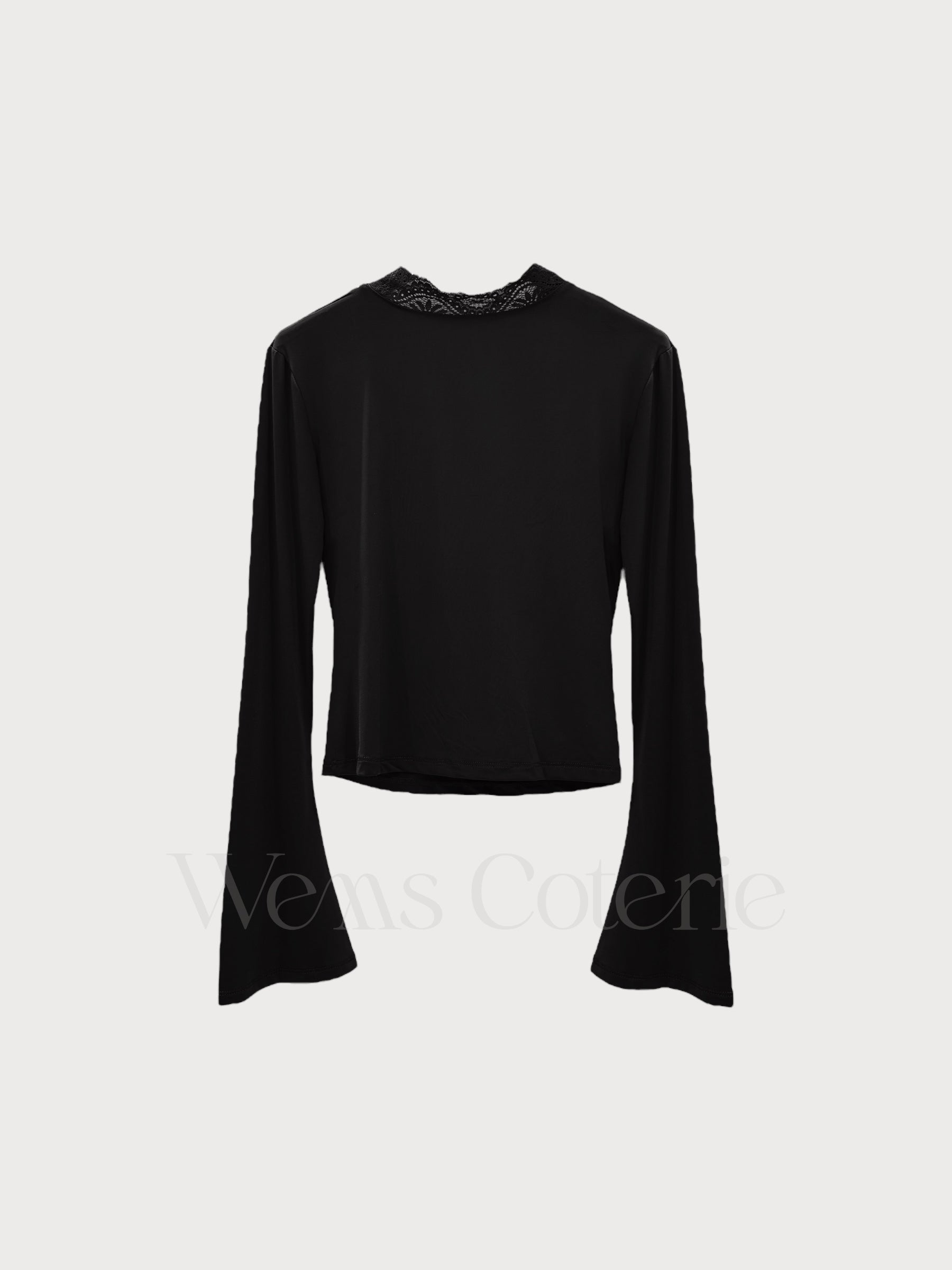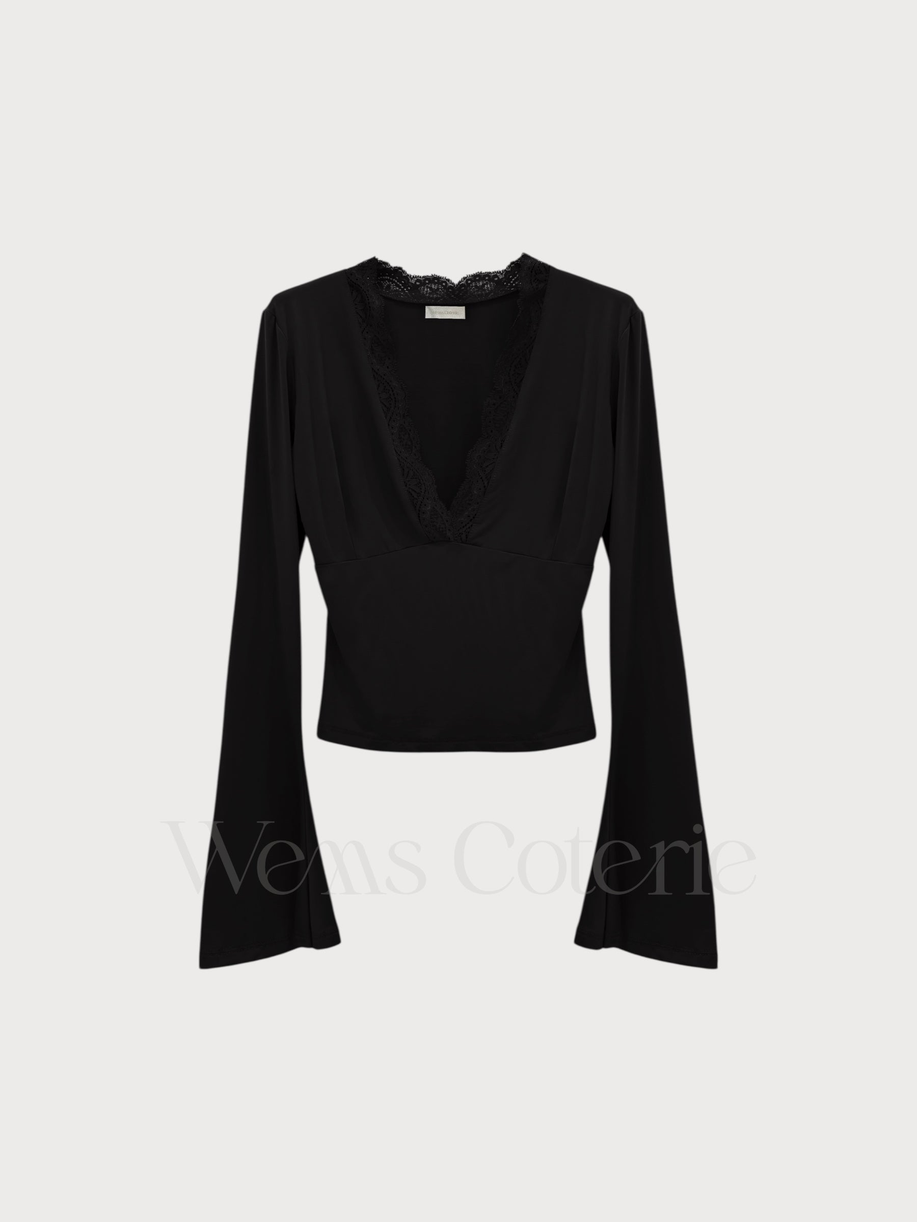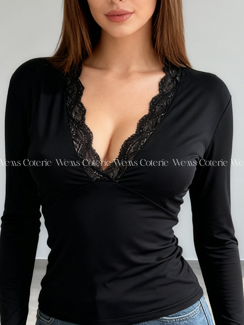 Fitted long-sleeve top in stretchy fabric with plunging V-neckline trimmed with lace detailing. Long sleeves with a slight flare at the cuff.