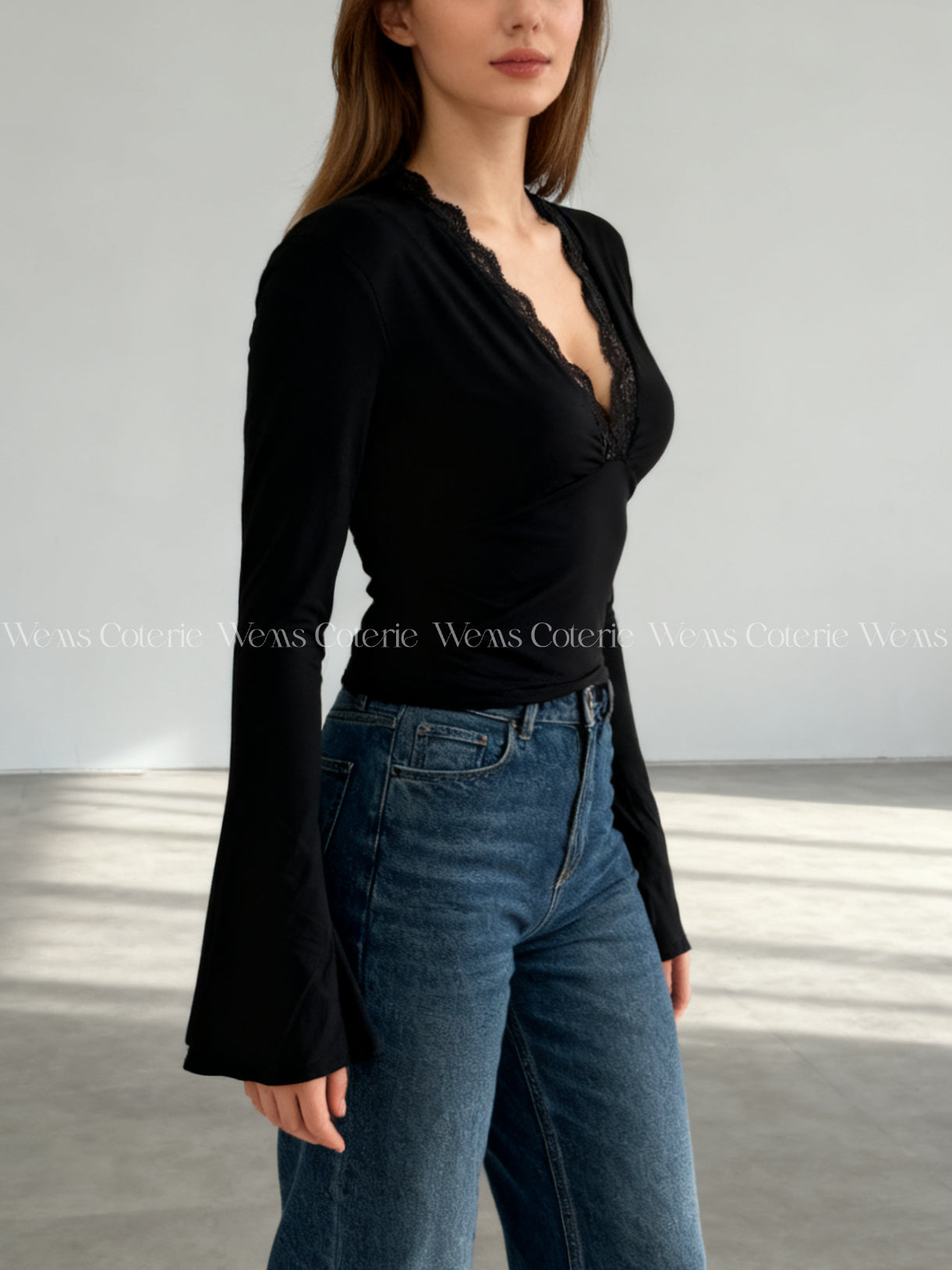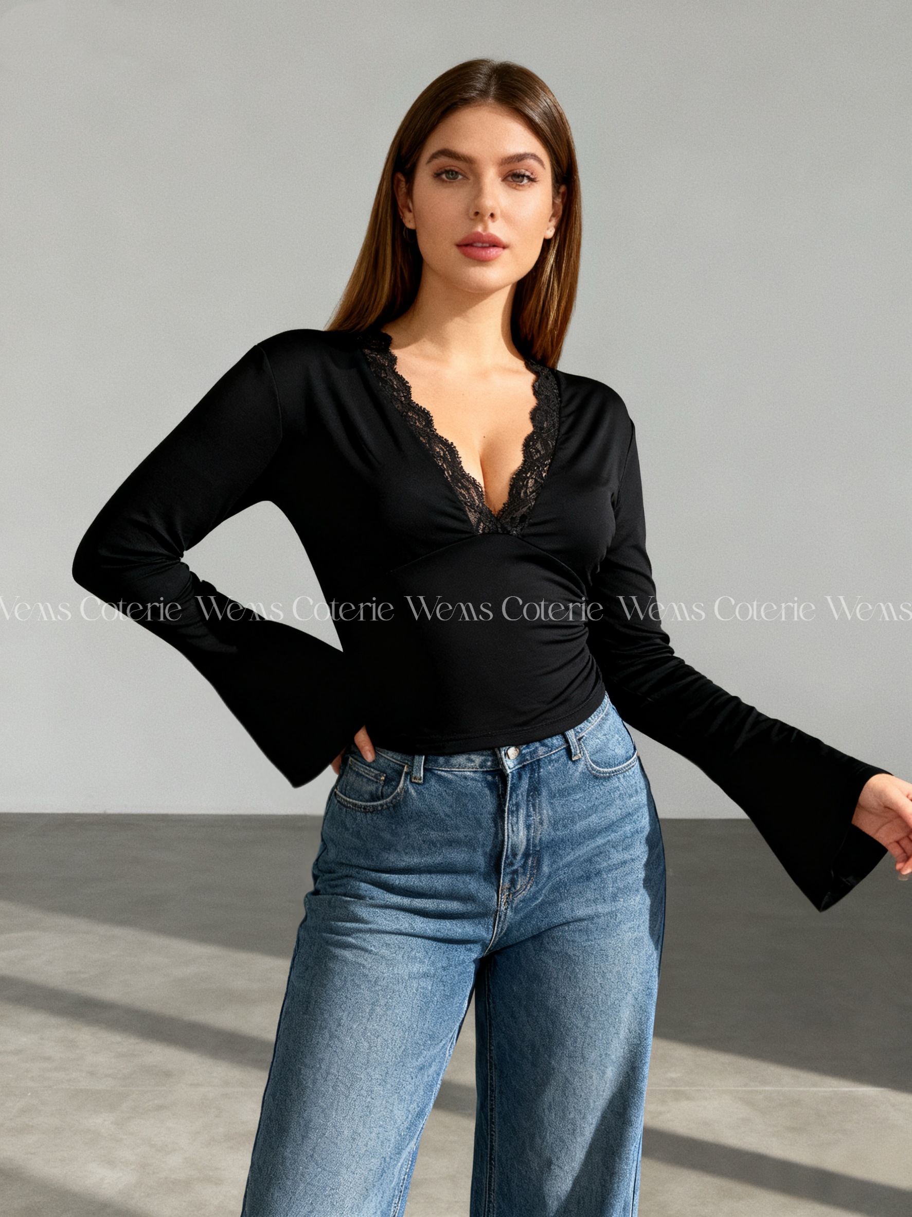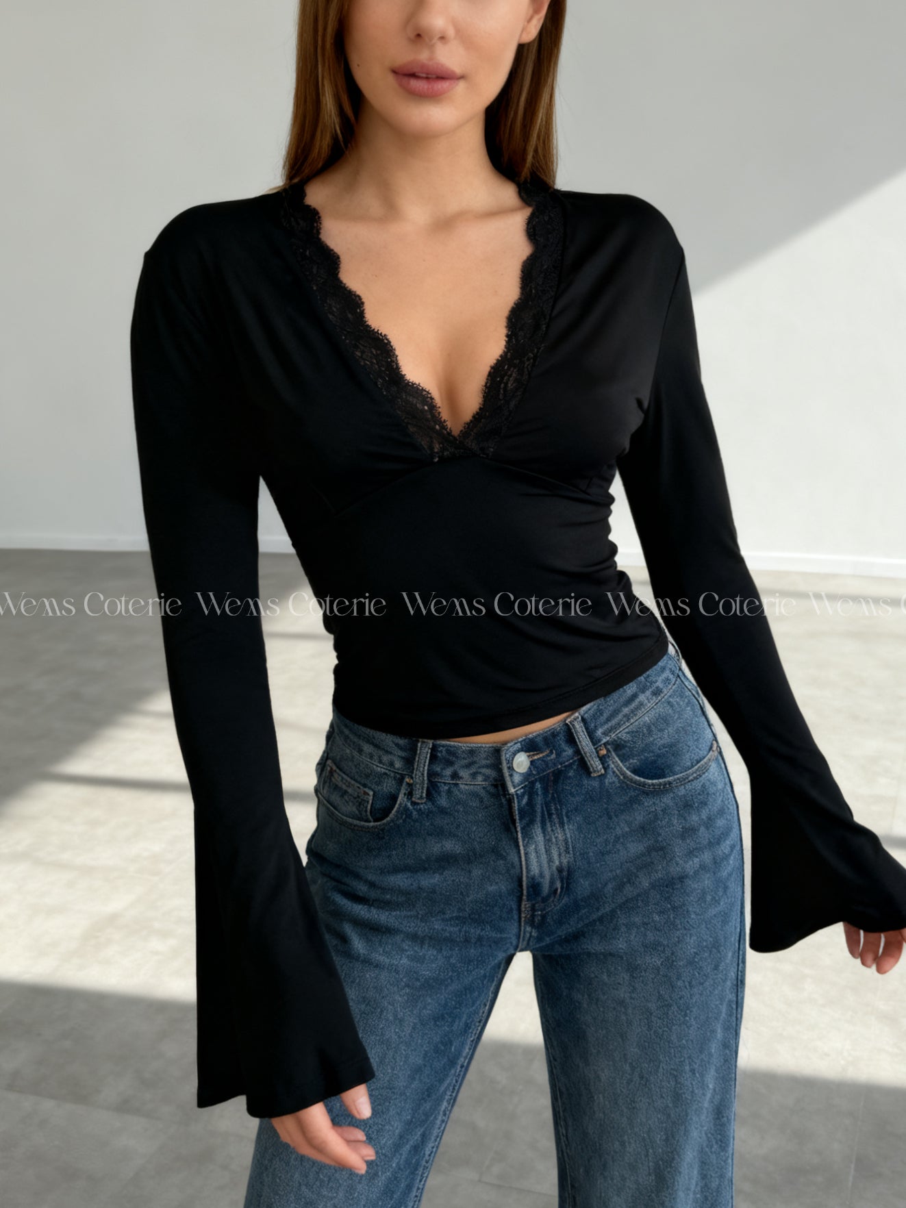 Fitted long-sleeve top in stretchy fabric with plunging V-neckline trimmed with lace detailing. Long sleeves with a slight flare at the cuff.