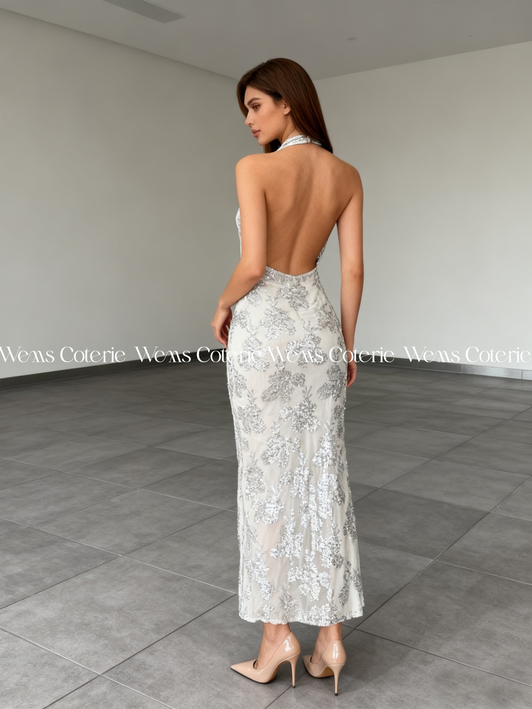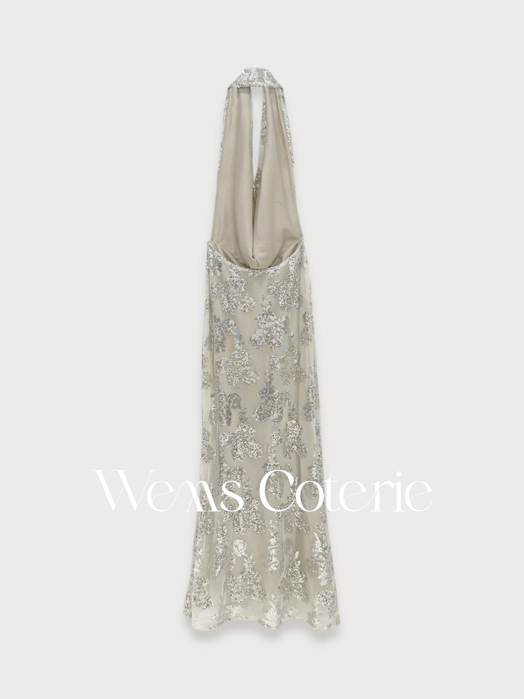 Long dress featuring a pattern of sequin floral embroidery, has a halter neckline with a draped, cowl-neck style bodice that plunges deeply at the front that gives a stunning open, backless design and a fitted, bodycon silhouette that flares slightly near the hem.