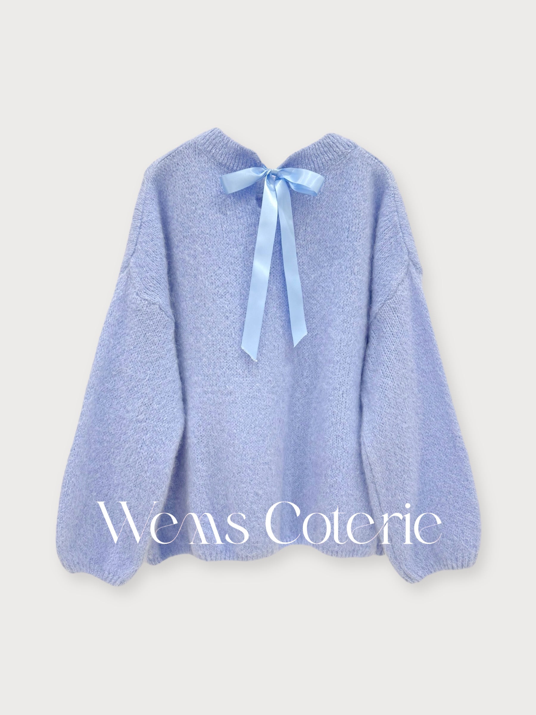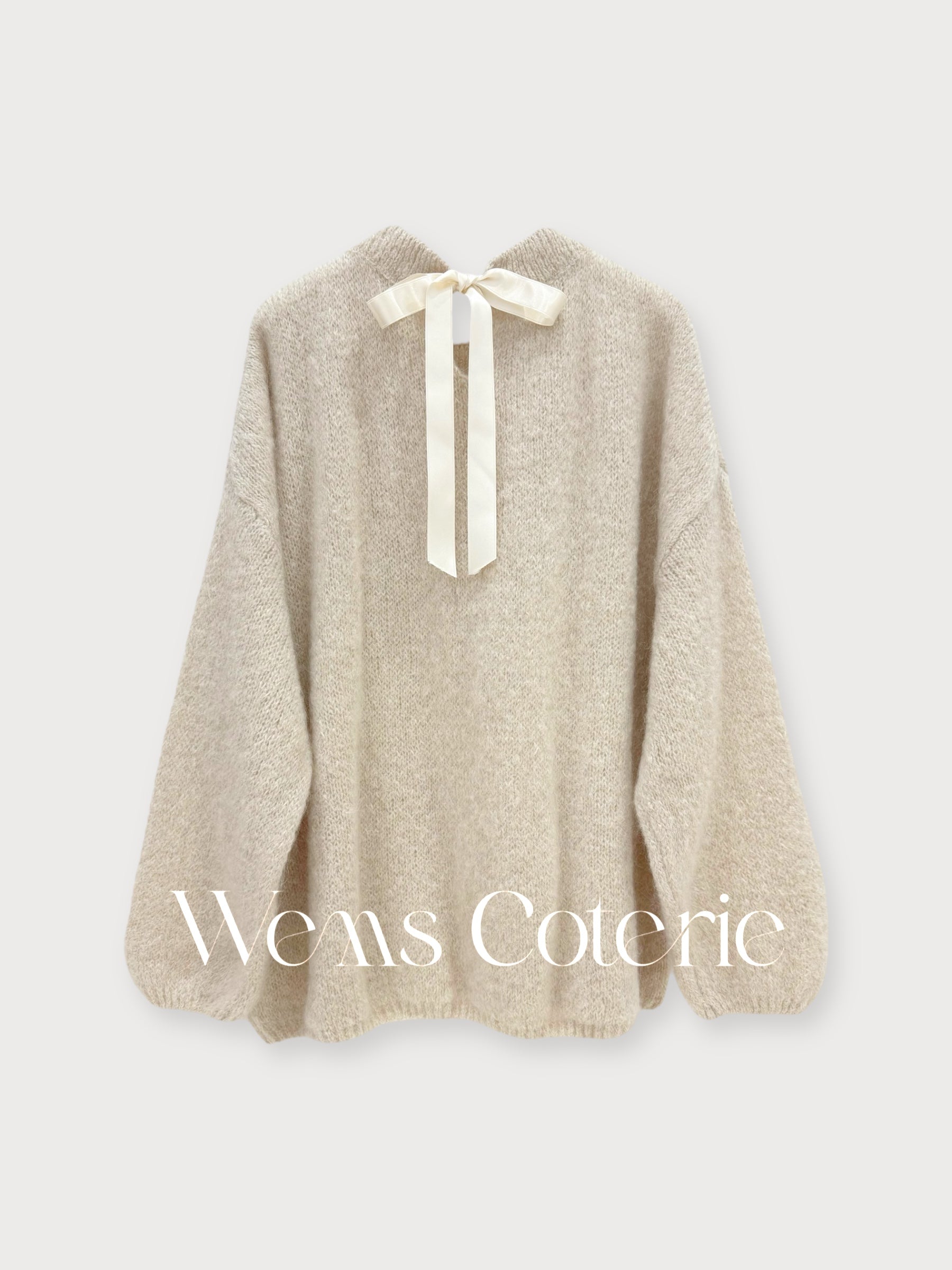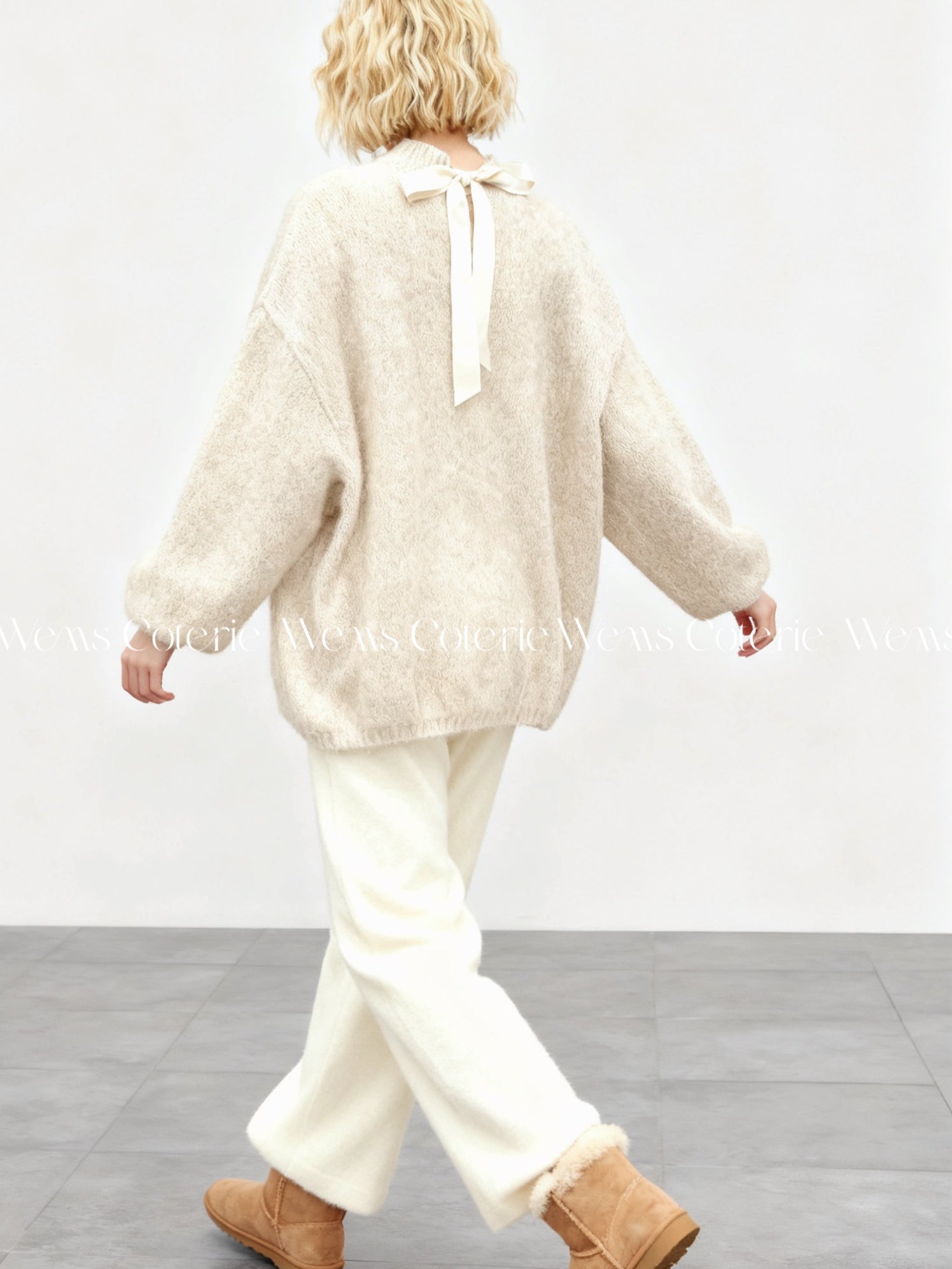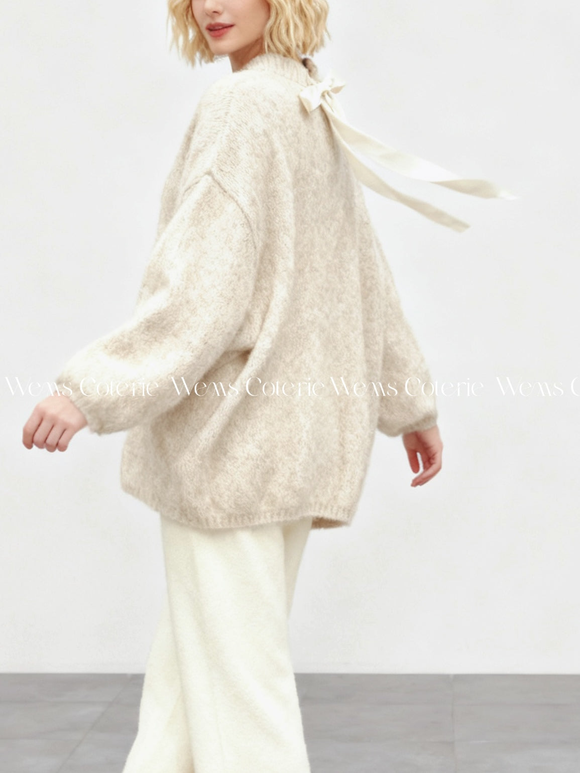 Oversized knit sweater featuring a soft, textured fabric, a single front chest pocket, and a large satin bow detail at the back of the neck.