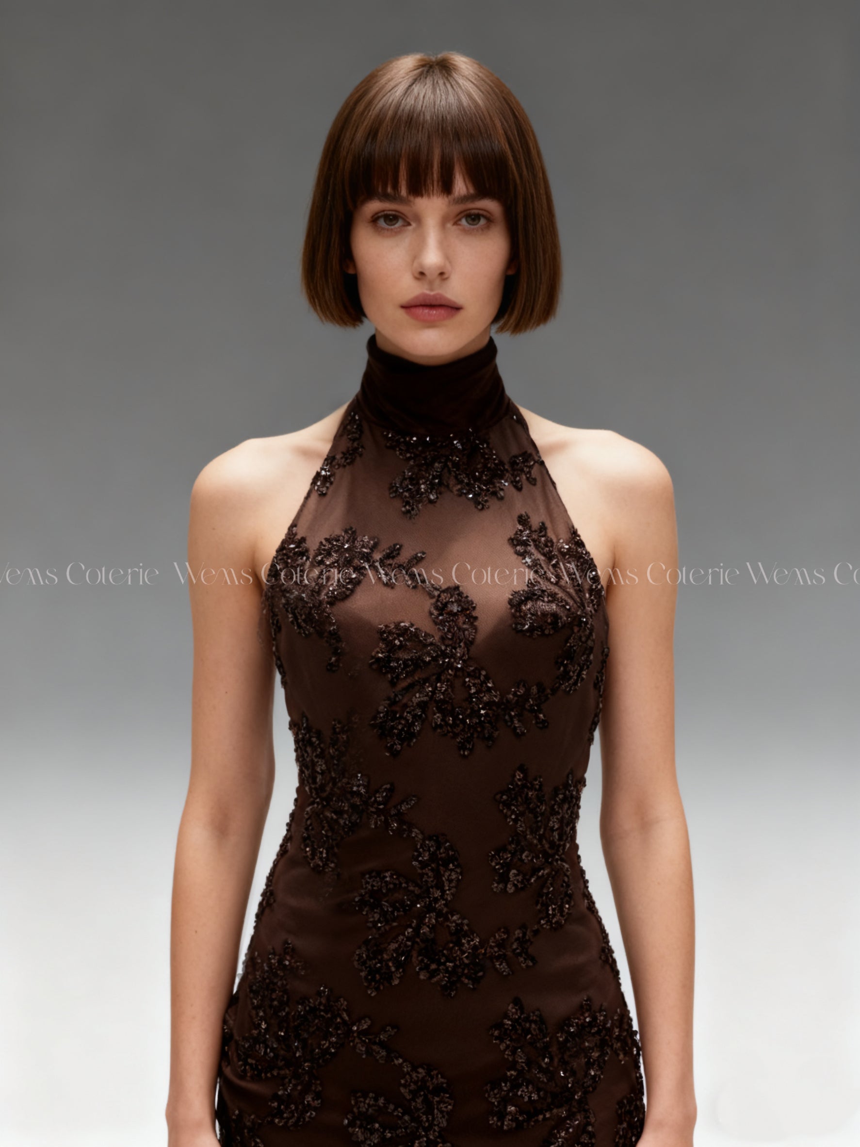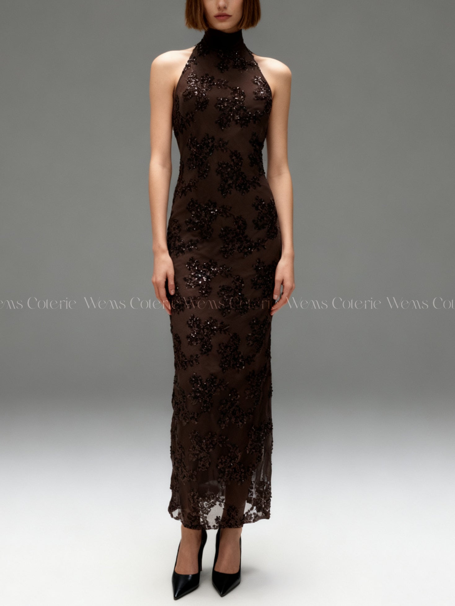 Maxi dress with a high mock neck that ties at the back, a plunging open back, and all-over sequin embellishments.