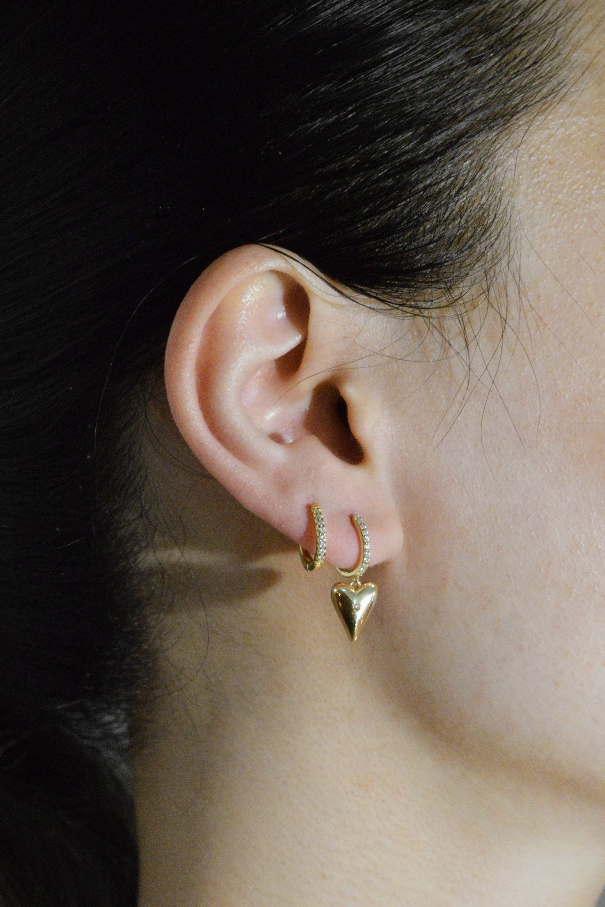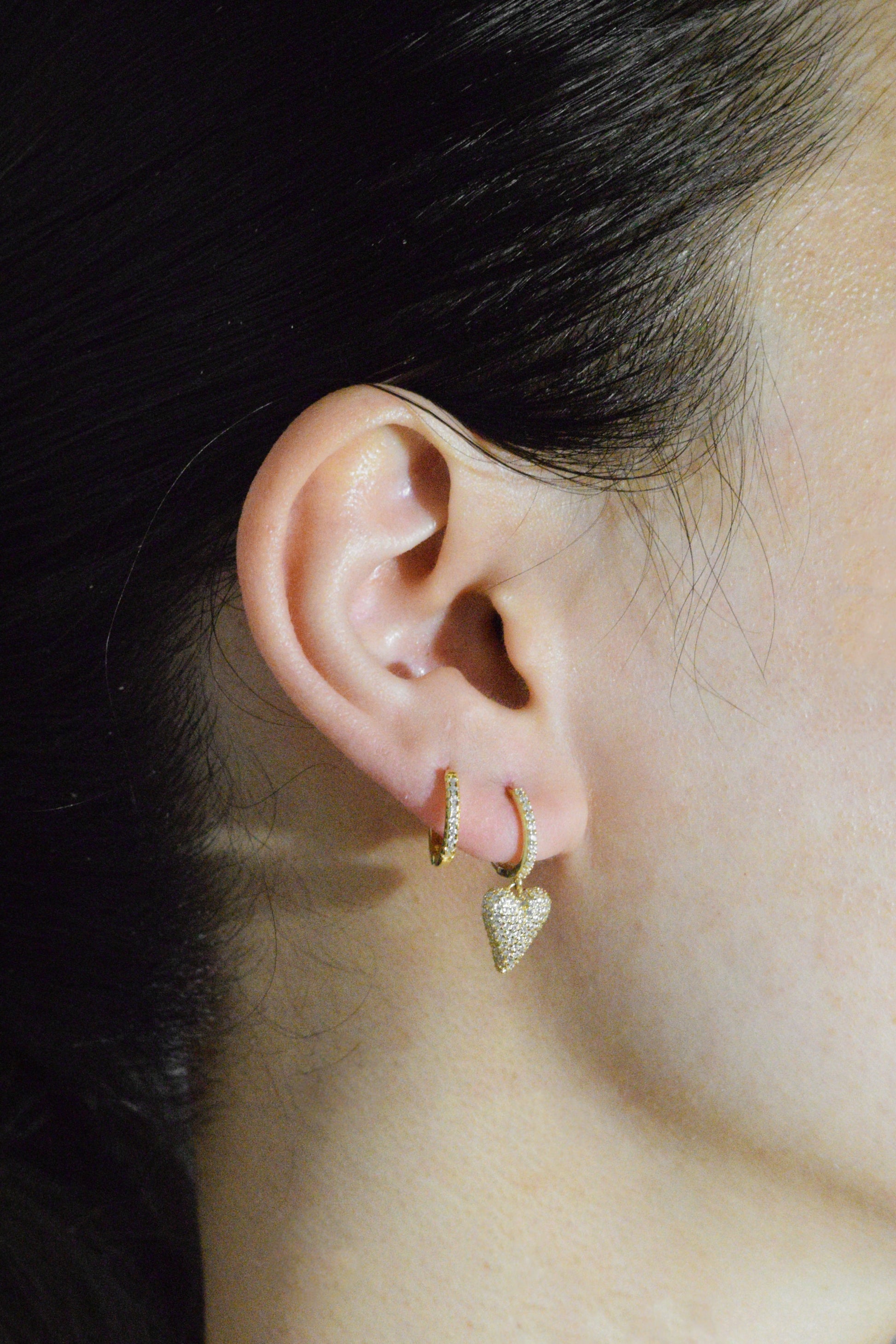 Asymmetric heart drop earrings with zirconia.
