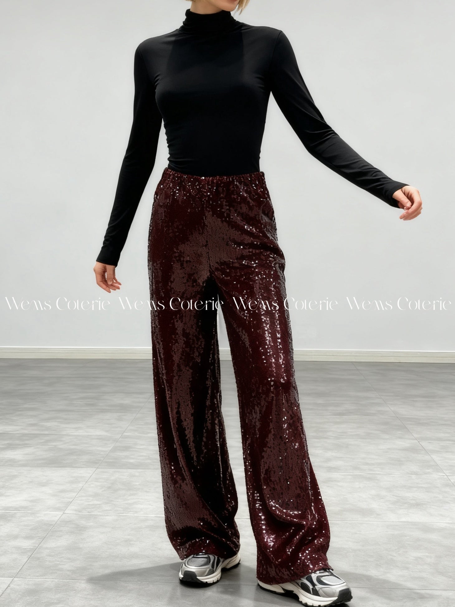 High-waisted, wide-leg trousers entirely covered in sequins. A comfortable elastic waistband and a relaxed, flowing fit through the leg.