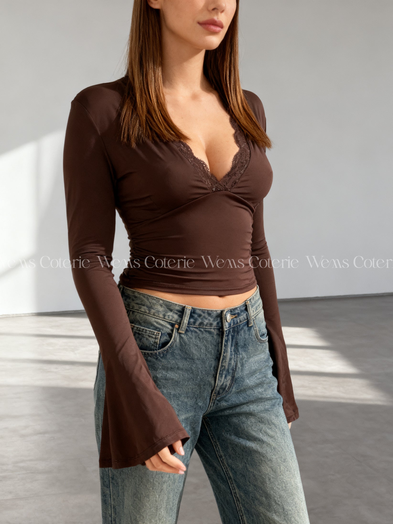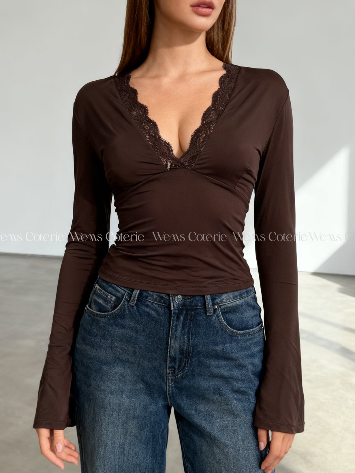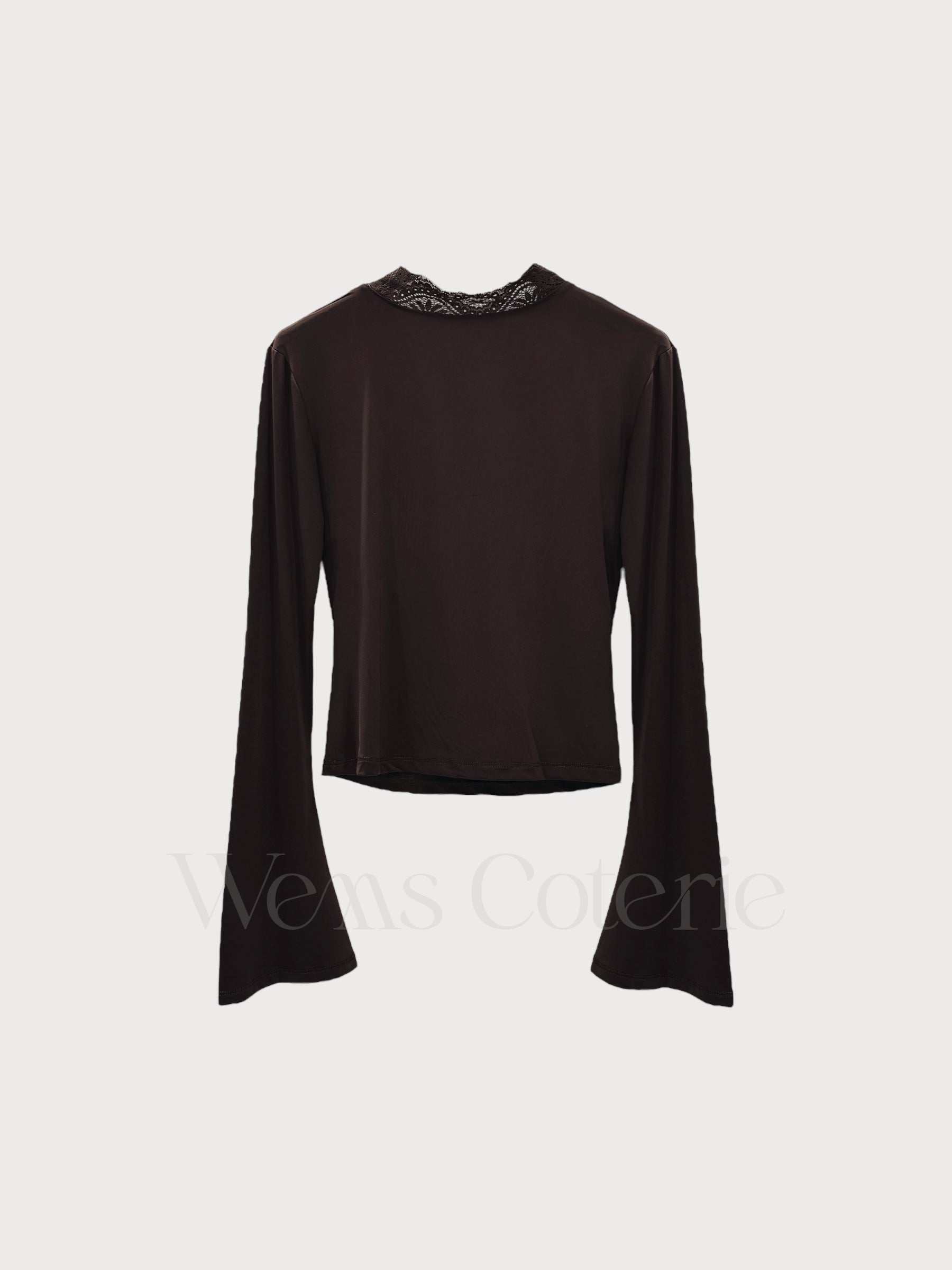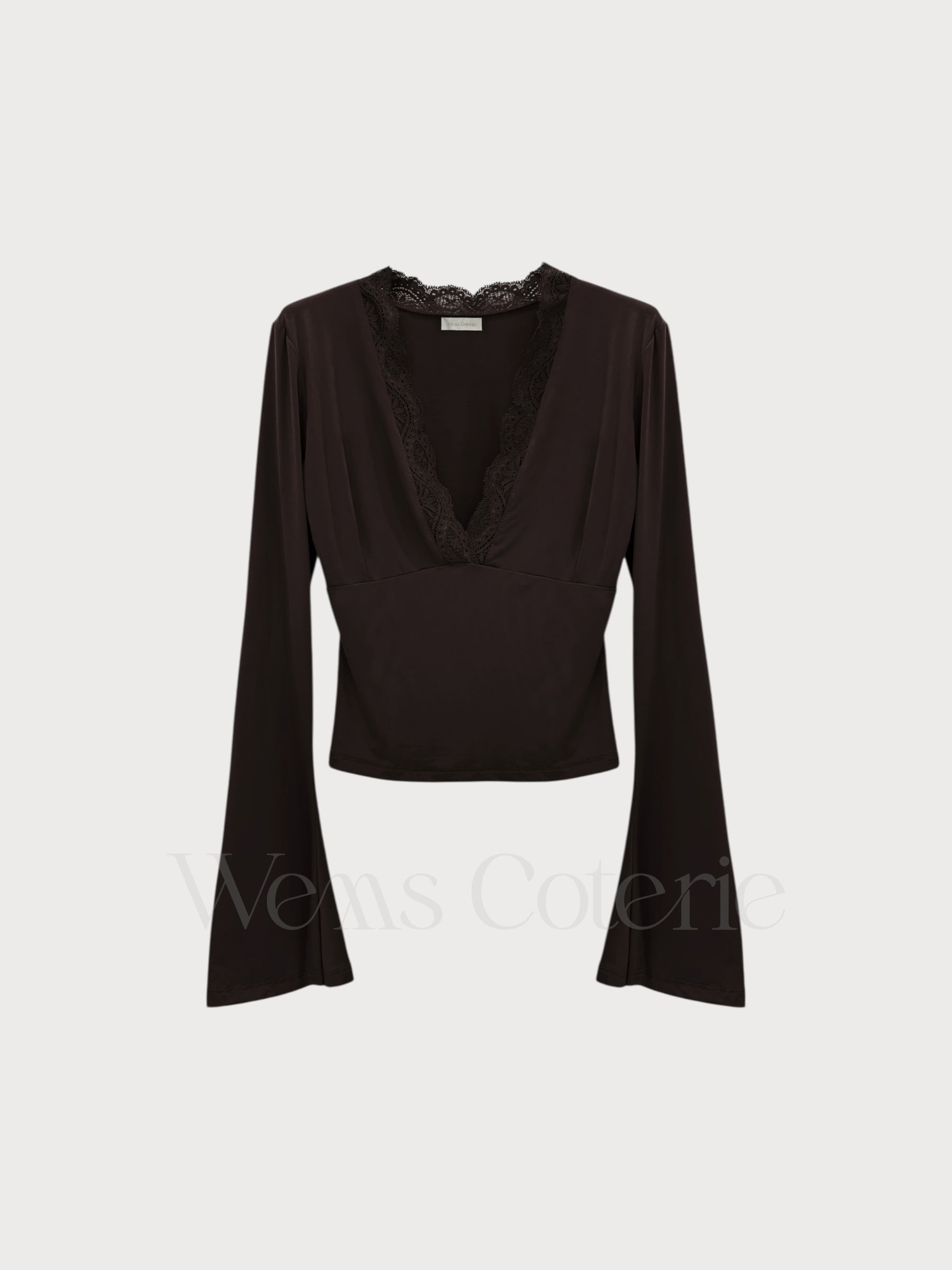 Fitted long-sleeve top in stretchy fabric with plunging V-neckline trimmed with lace detailing. Long sleeves with a slight flare at the cuff.