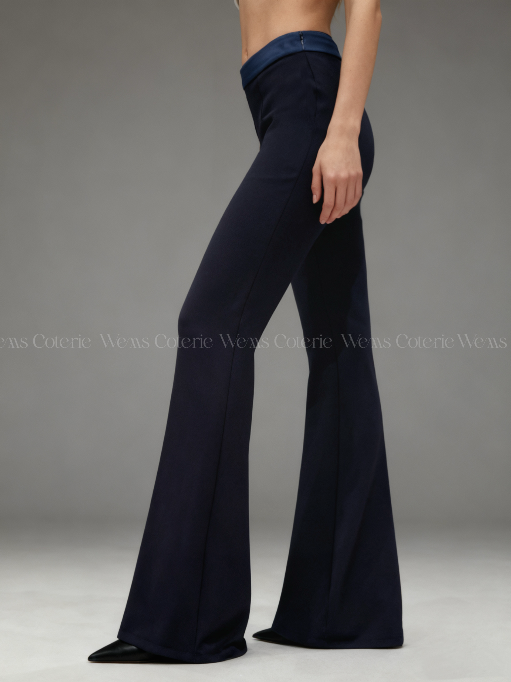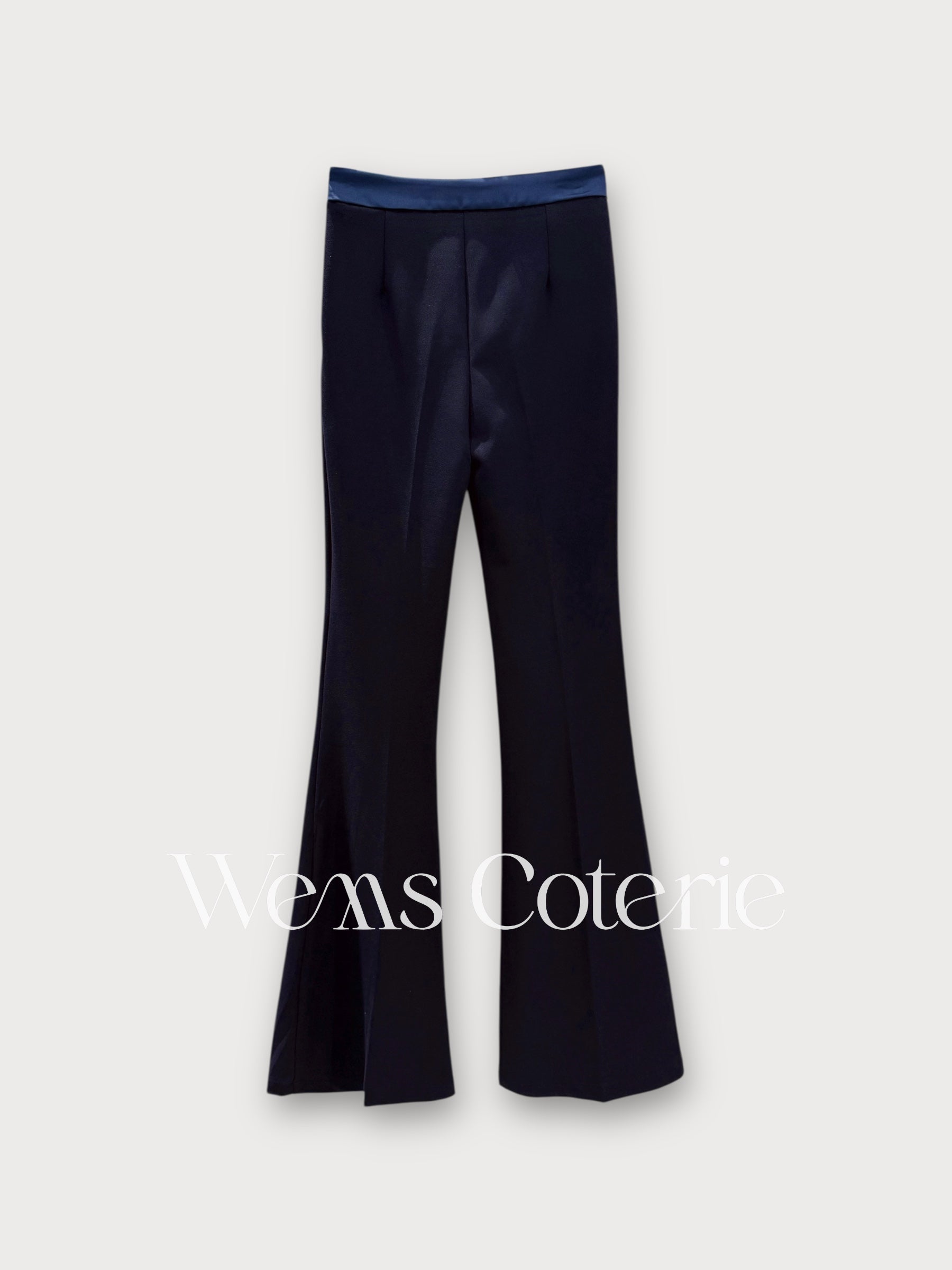 Fitted trousers with a flare bottom shape from the knee down. High-waist with a contrasting satin waistband, side zip closure.
