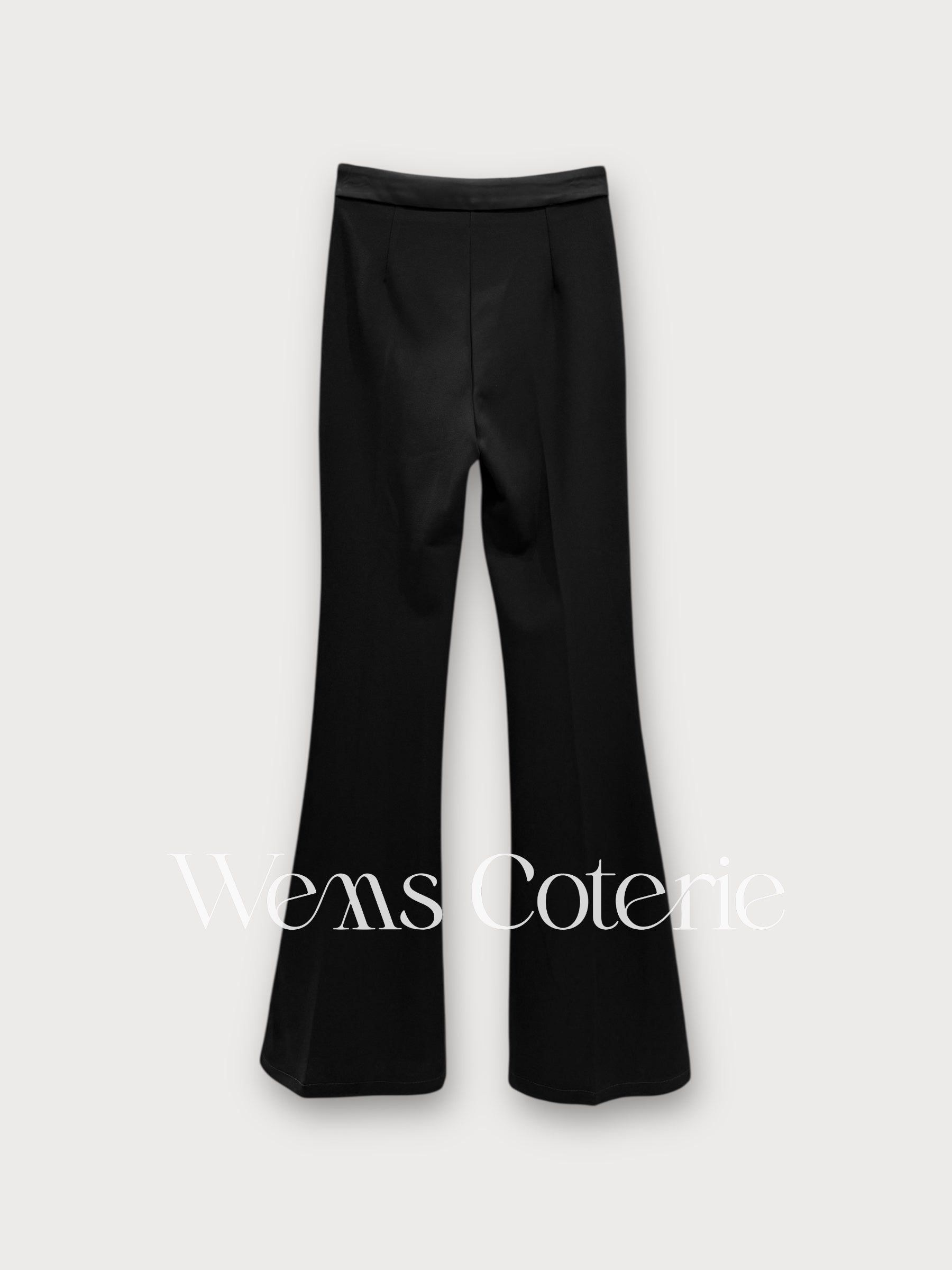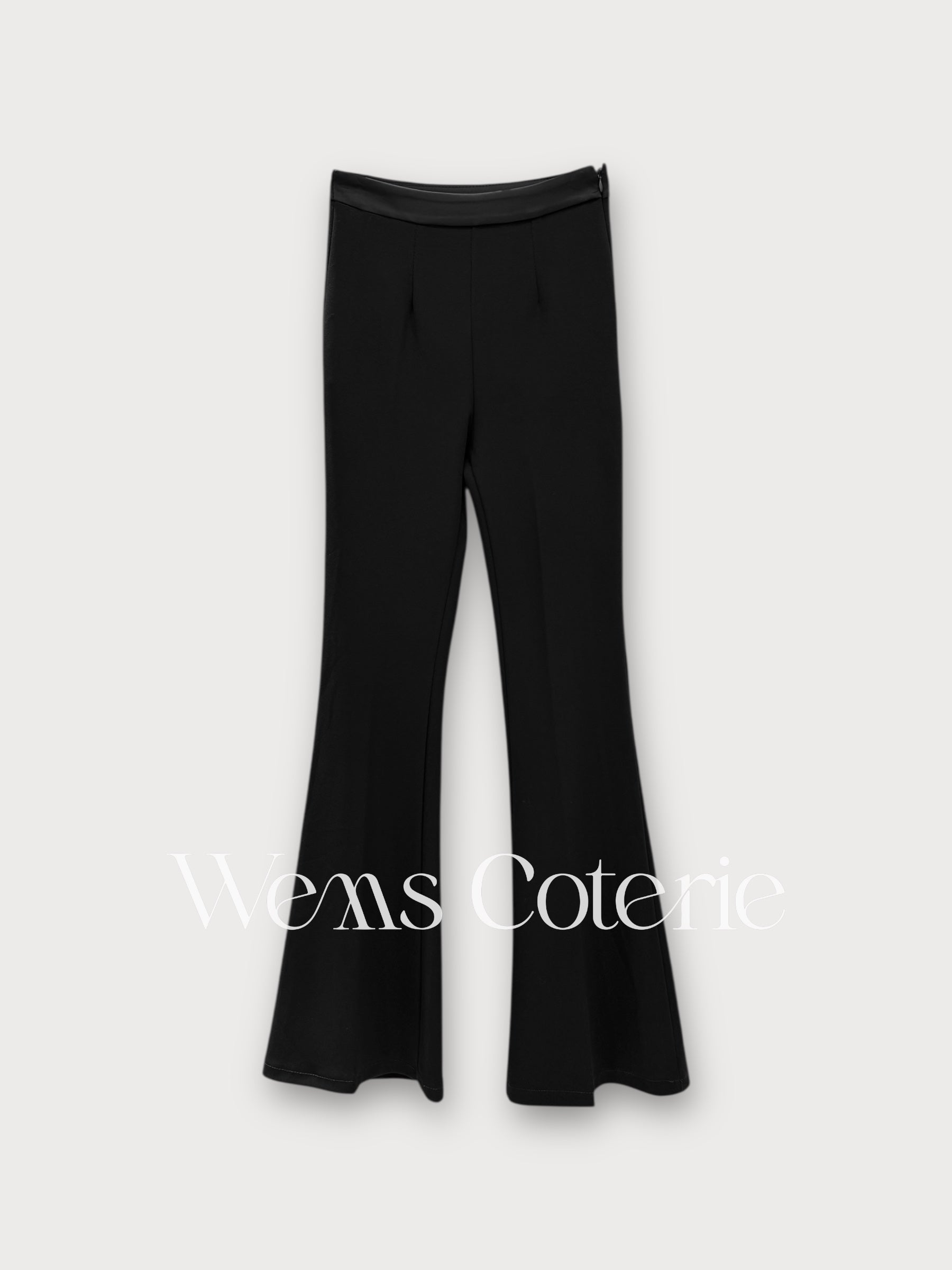 Fitted trousers in a stretch fabric with a flare bottom shape from the knee down. High-waist with a contrasting waistband, side zip closure.